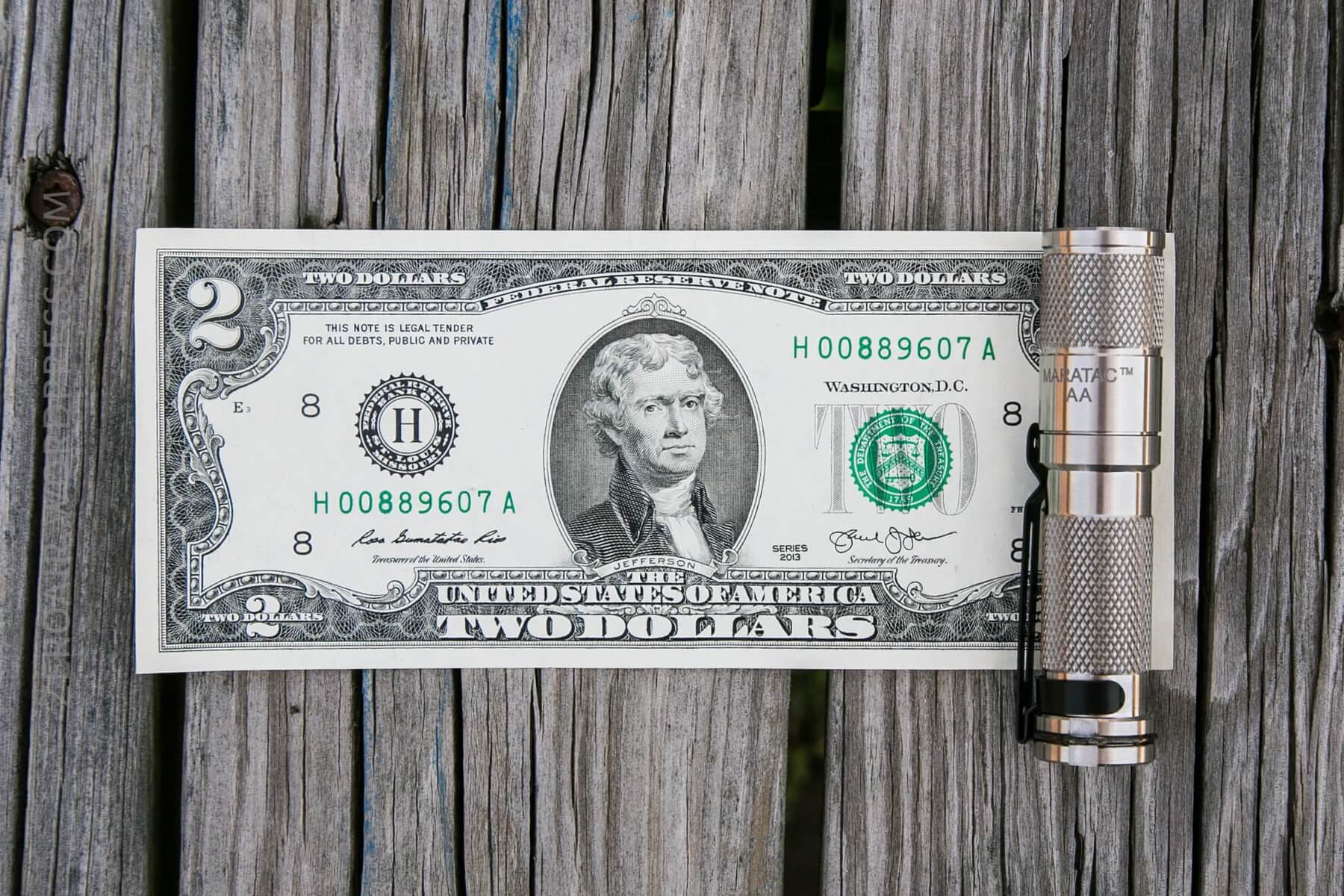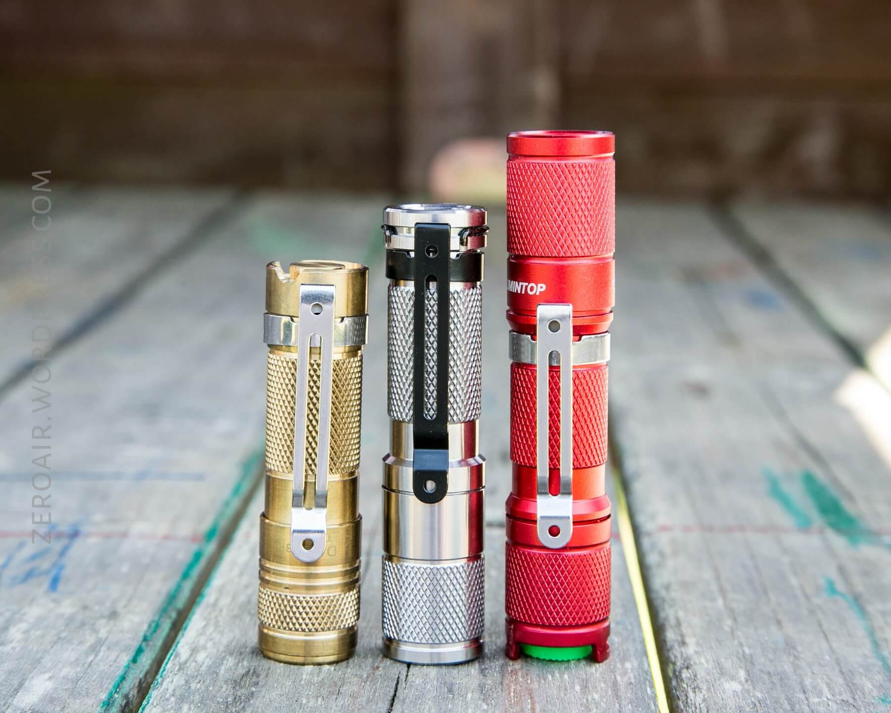 This is not my smallest AA light, but it’s close. The DQG AA (seen below in brass) is smaller, likely due to having a TIR instead of a reflector like this Maratac. It’s a great size, to be honest. A short clicky is still much longer (see the red Lumintop, below).