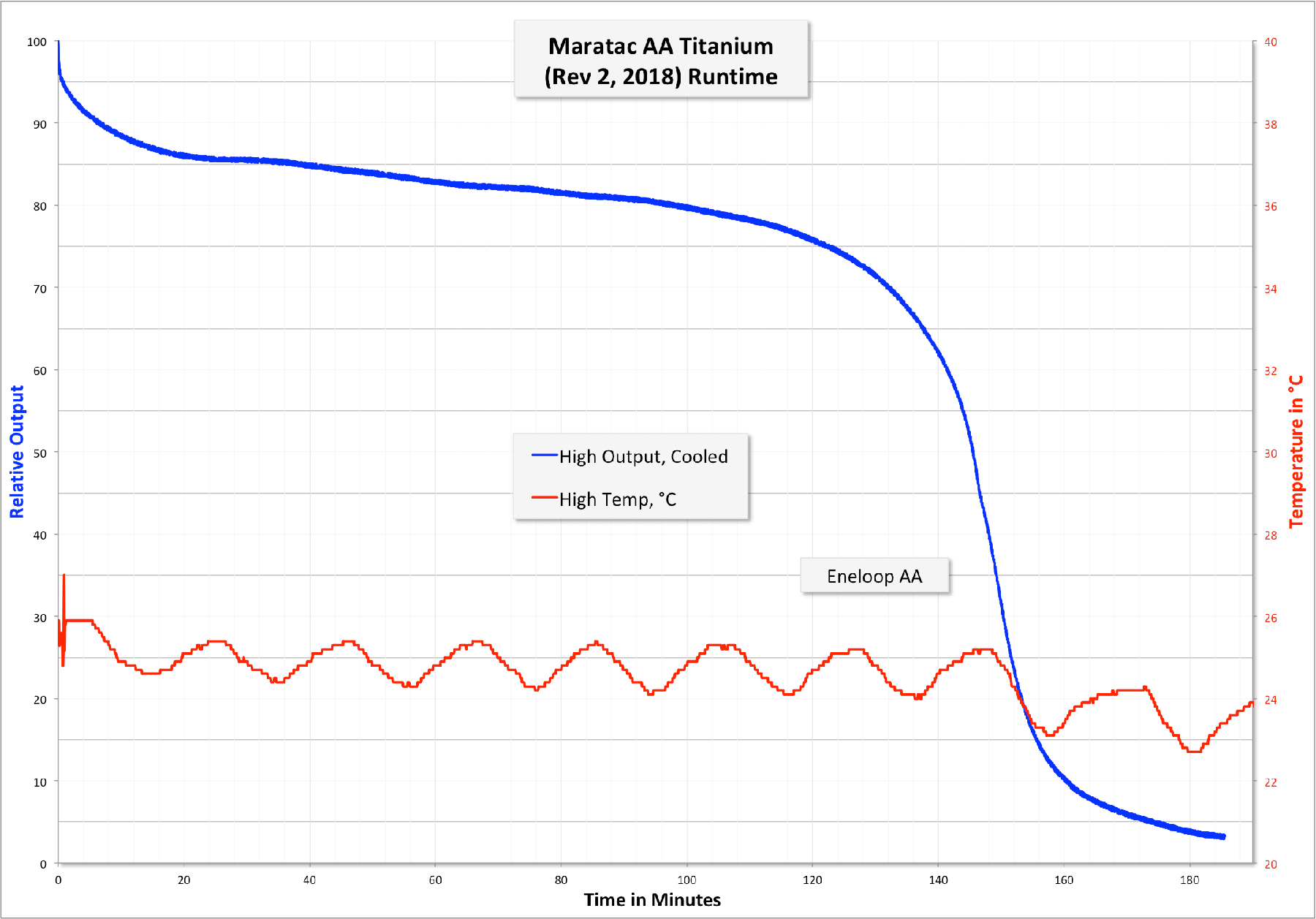 The claimed runtime on high is 75 minutes, and the AA Ti gets around that. The output tracks cell voltage all the way down, and eventually switches to the very low mode seen below. (around 2% of initial output). (The temperature variations cycle with the room temp.)