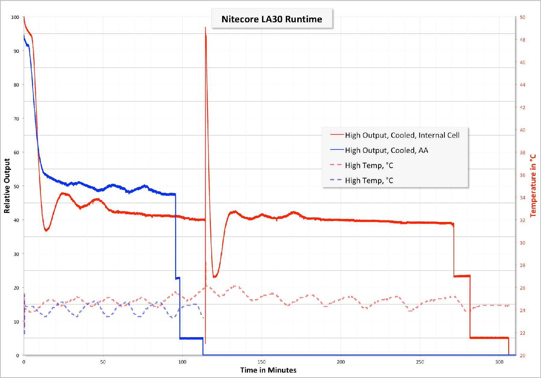 The primary power source for the LA30 is the internal cell, claimed at 1800mAh. This cell is not removable (nor is it even possible to non-destructively view the cell in my experience). In the runtime below, the internal cell is the red line. Note from that runtime that it’s possible to reset the light to the highest output, even after it’s stepped down. Also noteworthy is that the initial stepdown from the highest output to ~95% takes 10 minutes or so. Respectable.