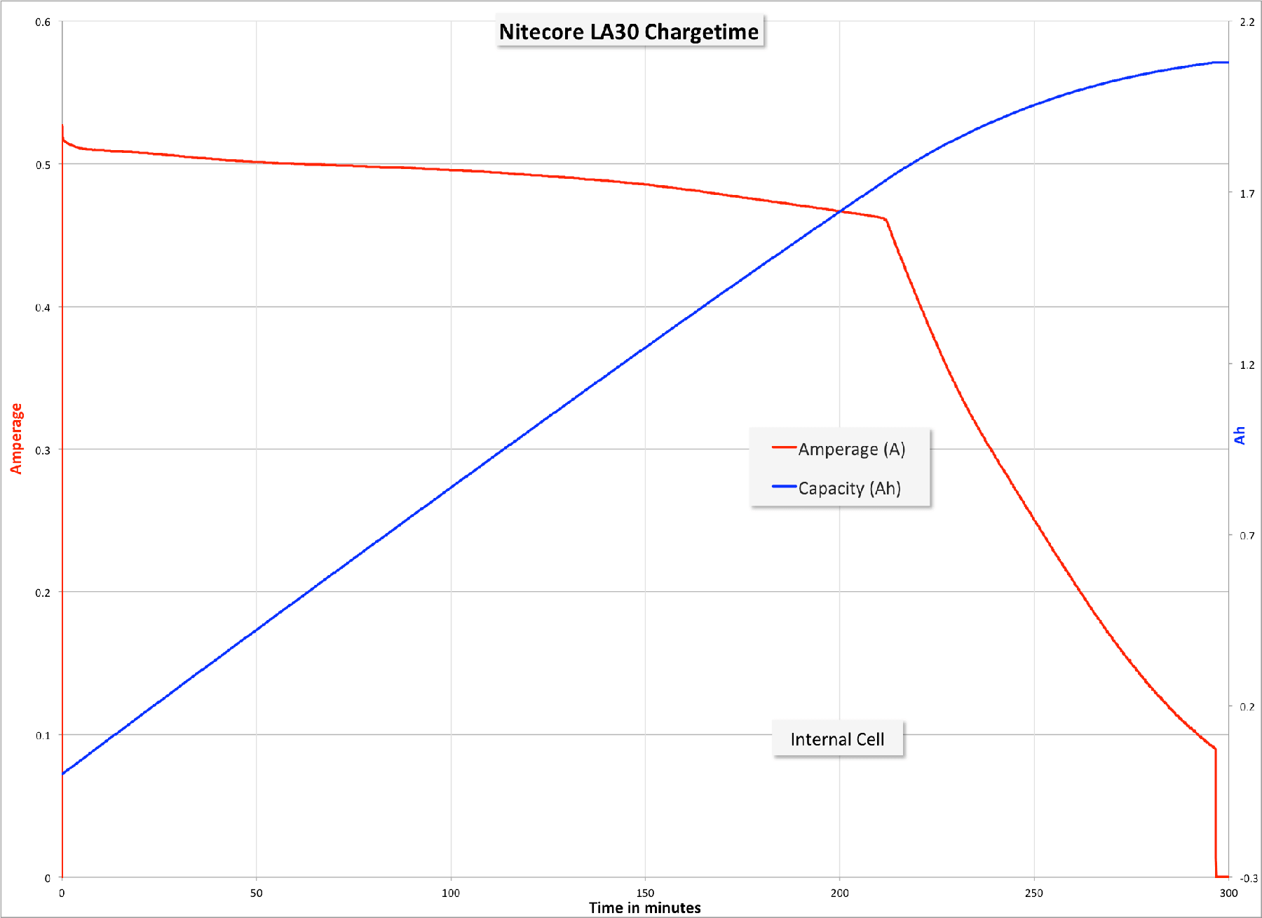 Below is a graph of the chargetime of the internal cell. The cell is rated at 1.8Ah and tests much higher. Charging is also respectable at 0.5A, and the charge graph is very clean throughout.
