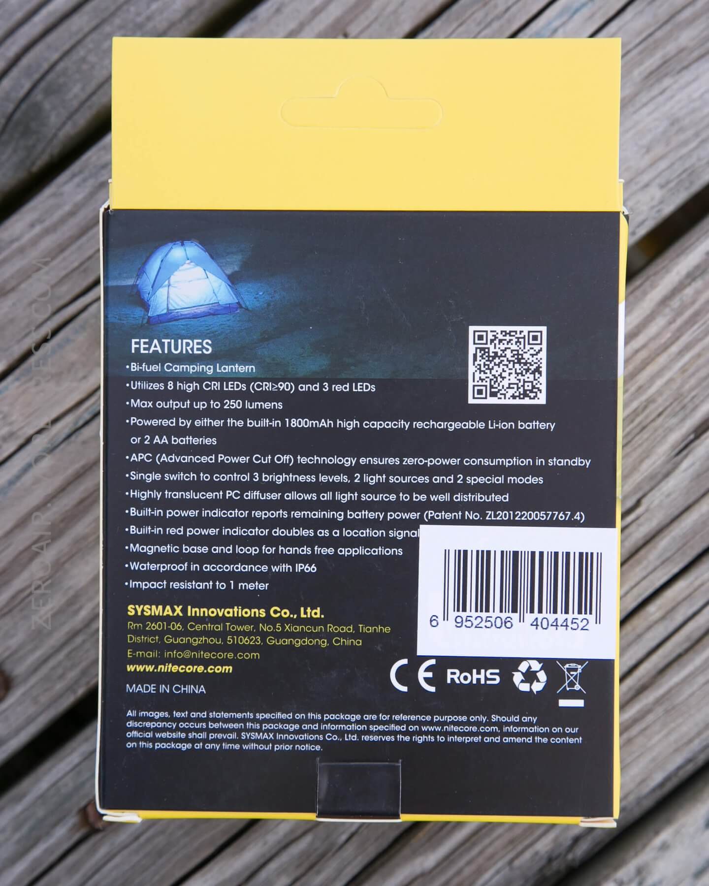 The LA30 ships in Nitecore’s standard yellow and black package, with a bunch of printing and specs, and a photo.