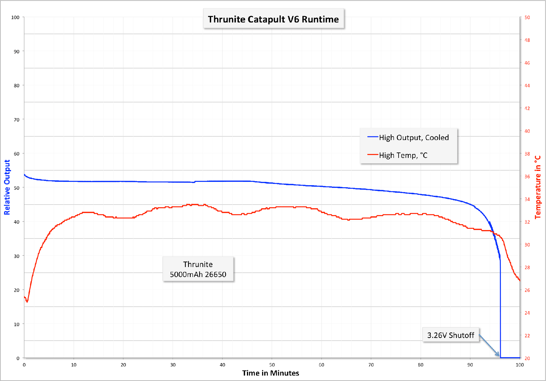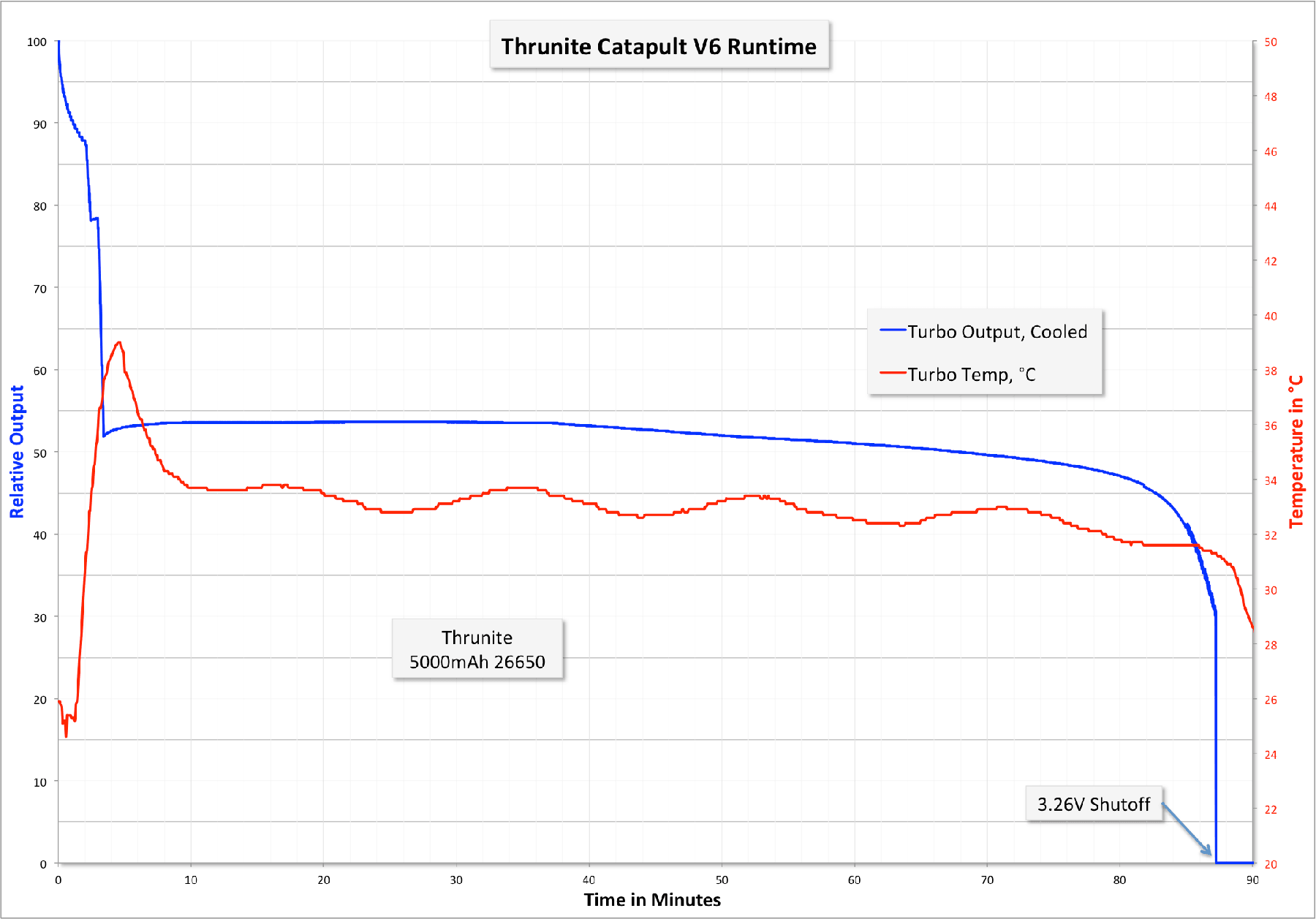 The Catapult V6 has a working voltage: 2.75V-4.2V. In my experience, the light shuts off at 3.26V (seriously, exactly 3.26V in two runtime tests). That’s great. Might not suck every gram of energy out of a cell, but I like it anyway.