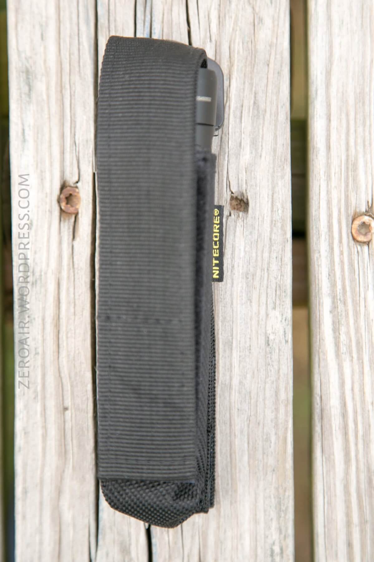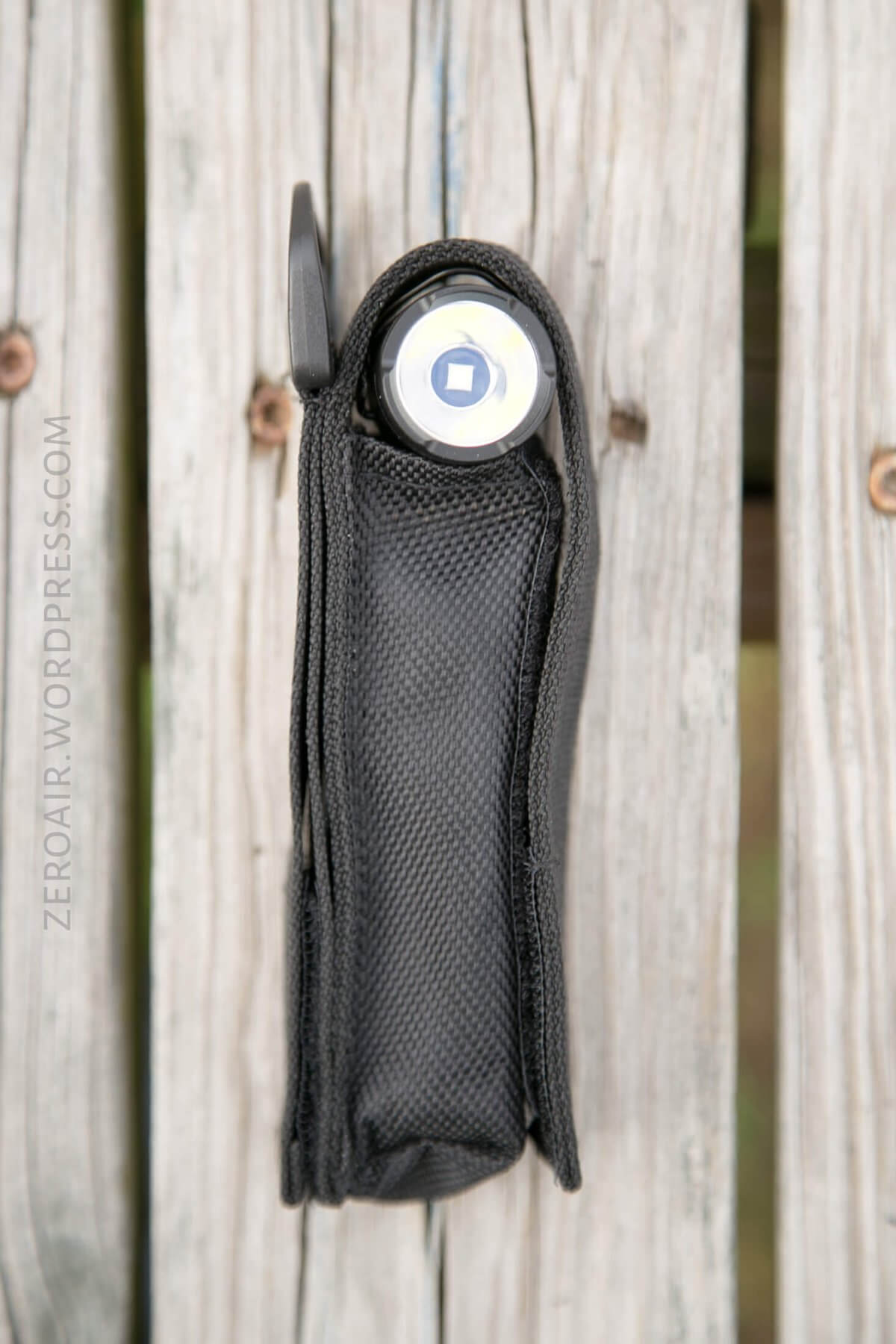 There’s a standard Nitecore nylon pouch, which has two belt loops, one of which is velcro. The light will go in either direction, and the bezel can be pointed outward, so (on lower modes) the light will be usable in the pouch.