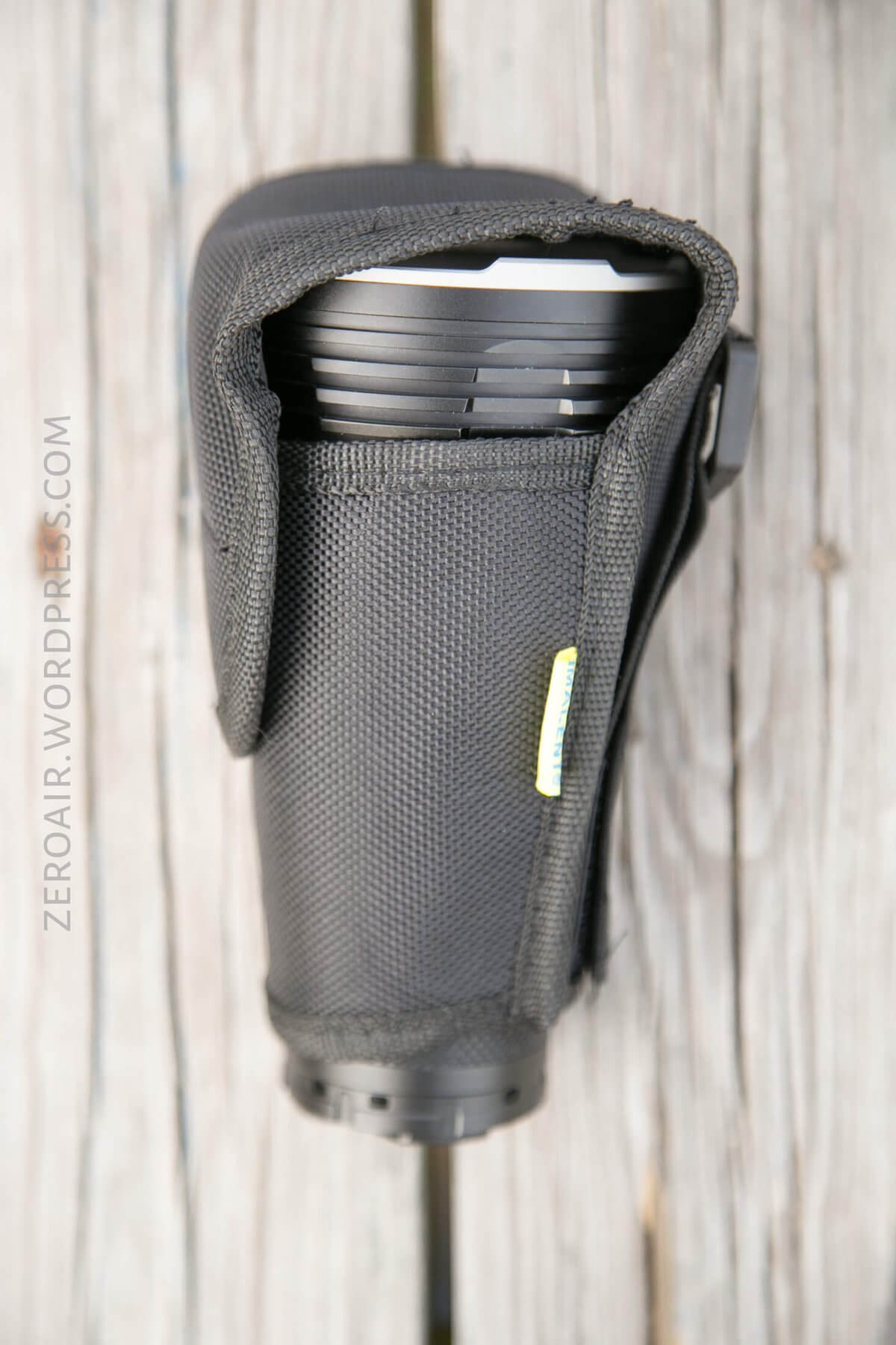 Imalent includes a directional nylon pouch. The bottom is open, and the light hangs out a little. The straps are double, with one being velcro and detaching at the bottom.