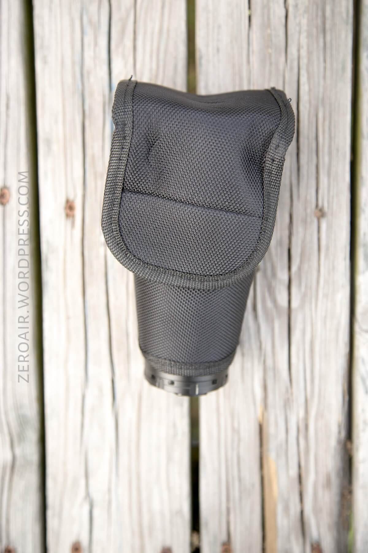 Imalent includes a directional nylon pouch. The bottom is open, and the light hangs out a little. The straps are double, with one being velcro and detaching at the bottom.