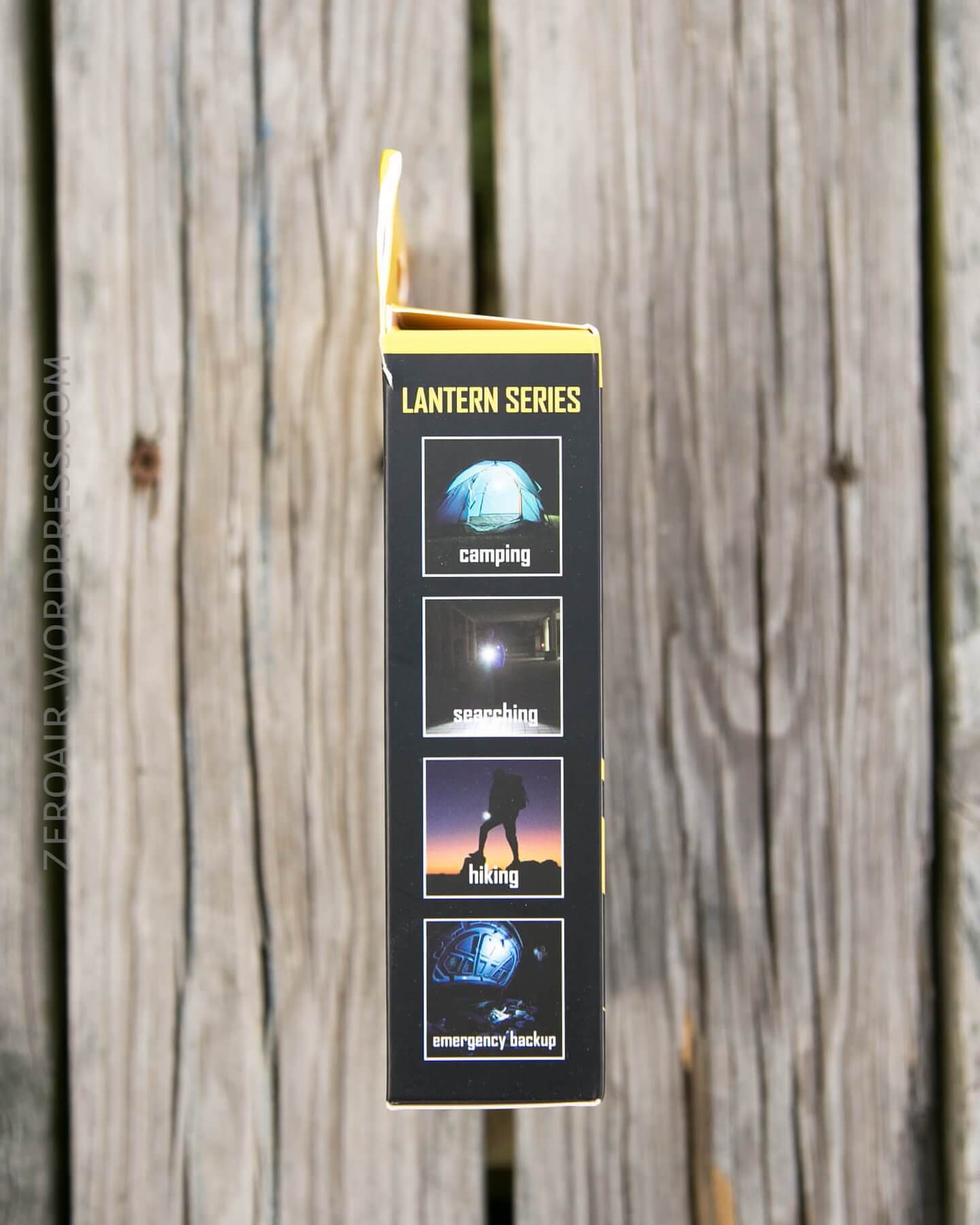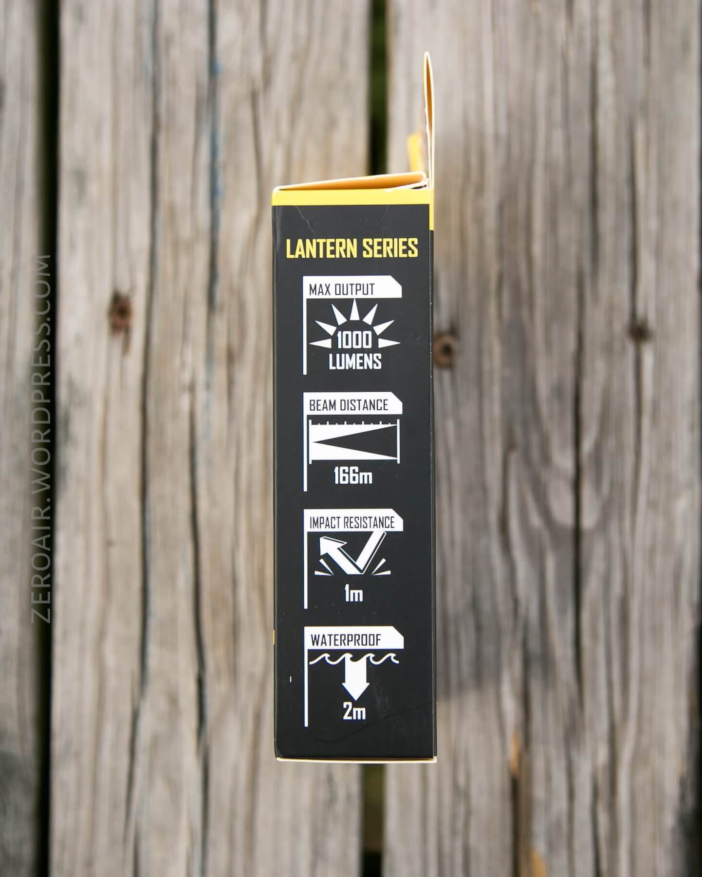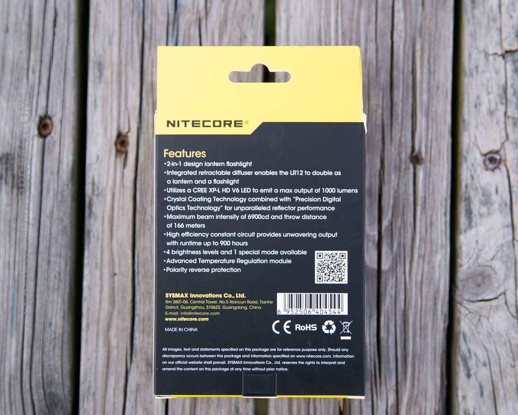 Nitecore’s typical black and yellow package, with specs and a photo of the light.