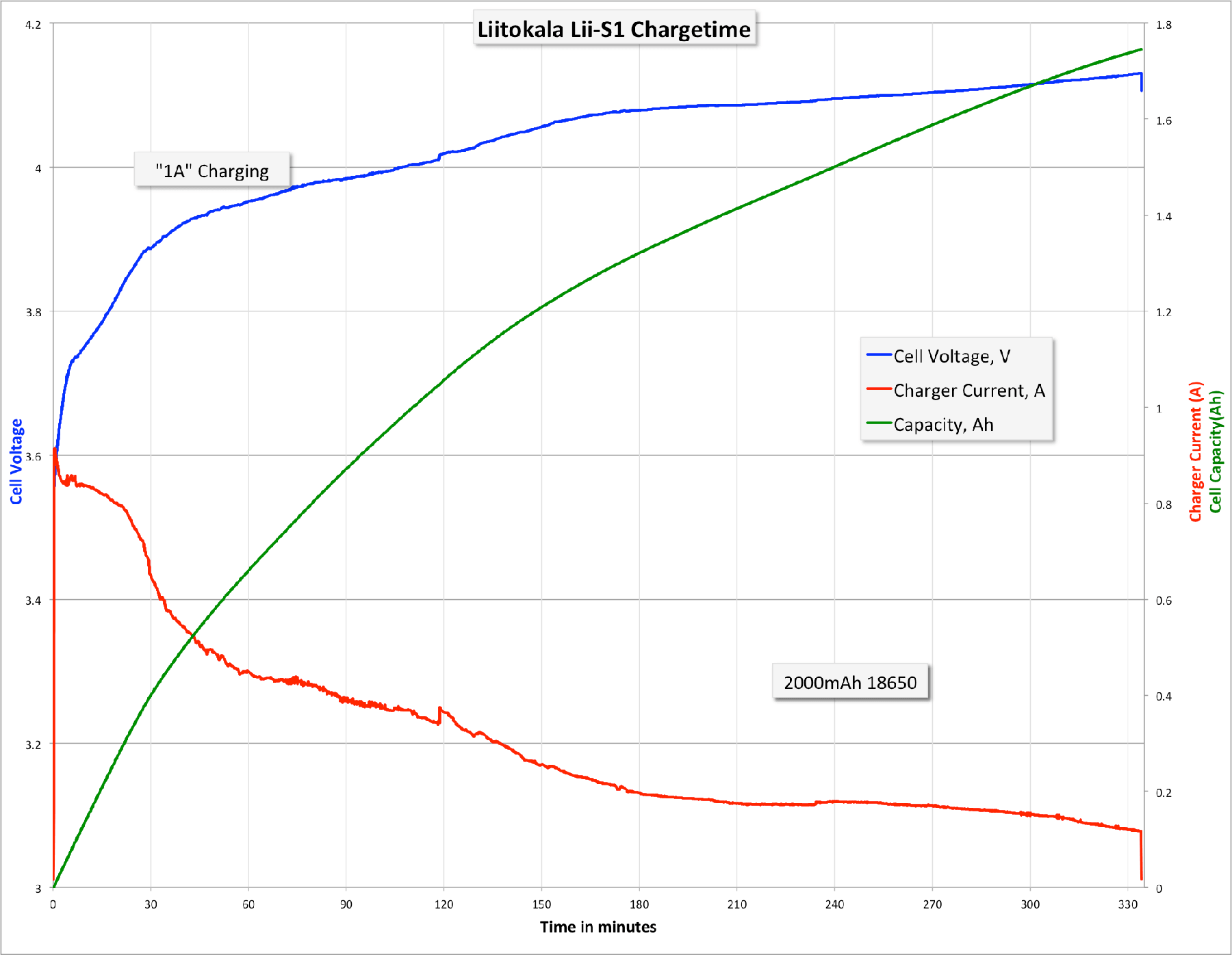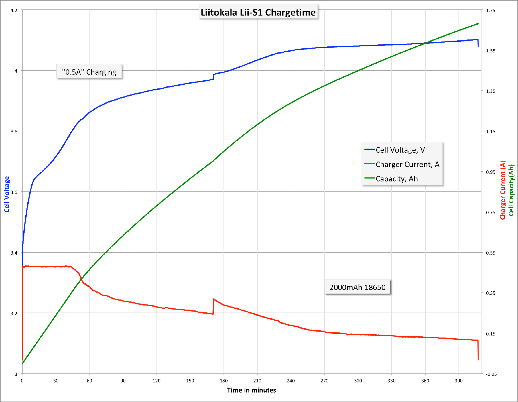 I tested only Li-Ion cells since my charger test setup doesn’t accommodate the lower voltage of NiMH. I tested both 1A and 0.5A settings. The results can be seen below.