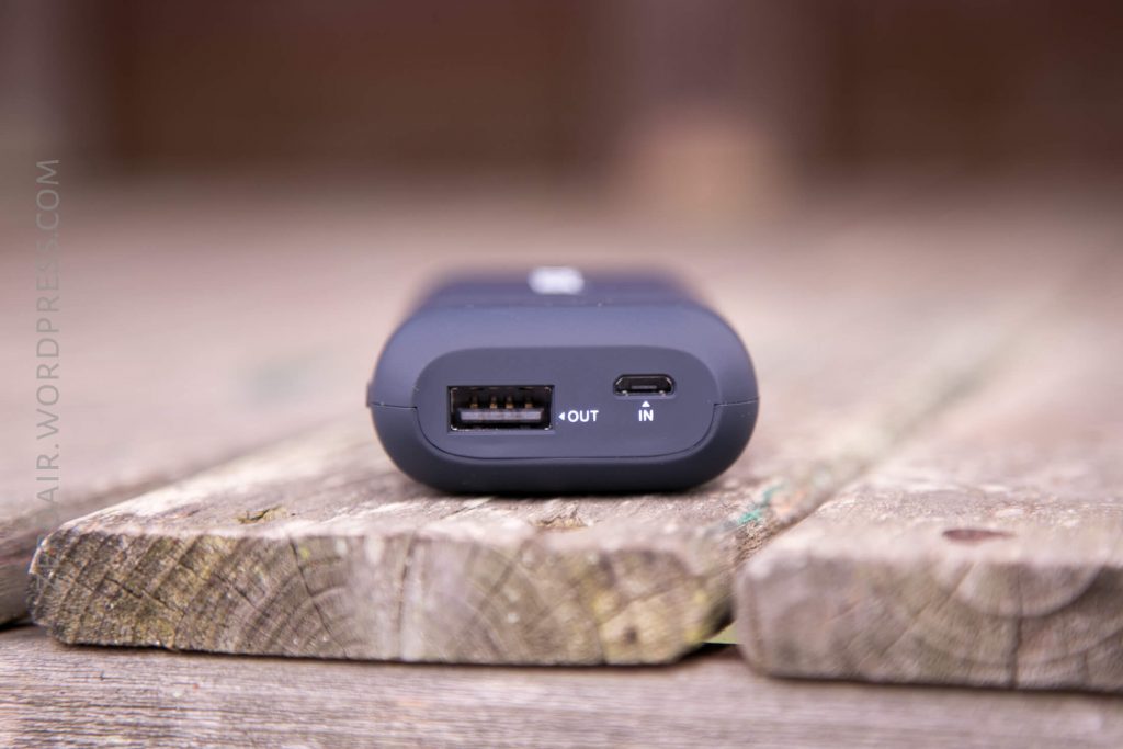 Input and output are on the same end. Input is via micro-USB, and output is USB. They’re labeled conveniently.