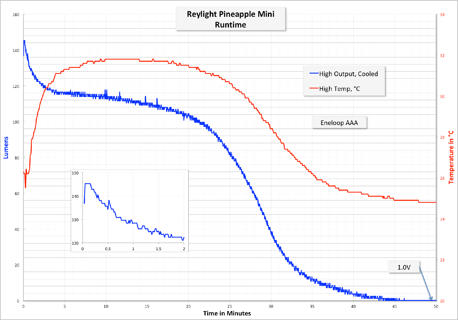 The Mini runs on a single AAA, but can also be used with a 10440 cell. All my testing is with AAA Eneloop cells. I don’t have 10440 on hand. Rey mentions that heat will become an issue with the Li-ion cell, but the light will be around 3x brighter with that cell.