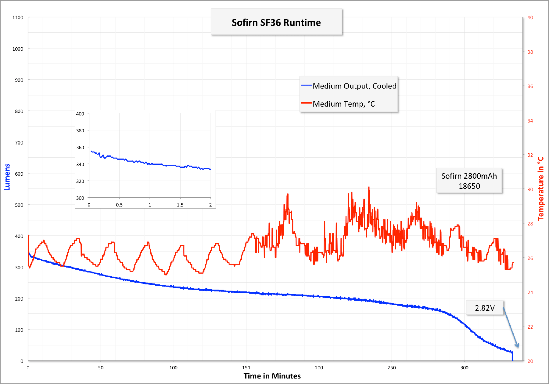 Here’s a runtime on High (the highest mode; no turbo!). This is of course with the included cell. Temperature is bouncing just due to house fluctuations.