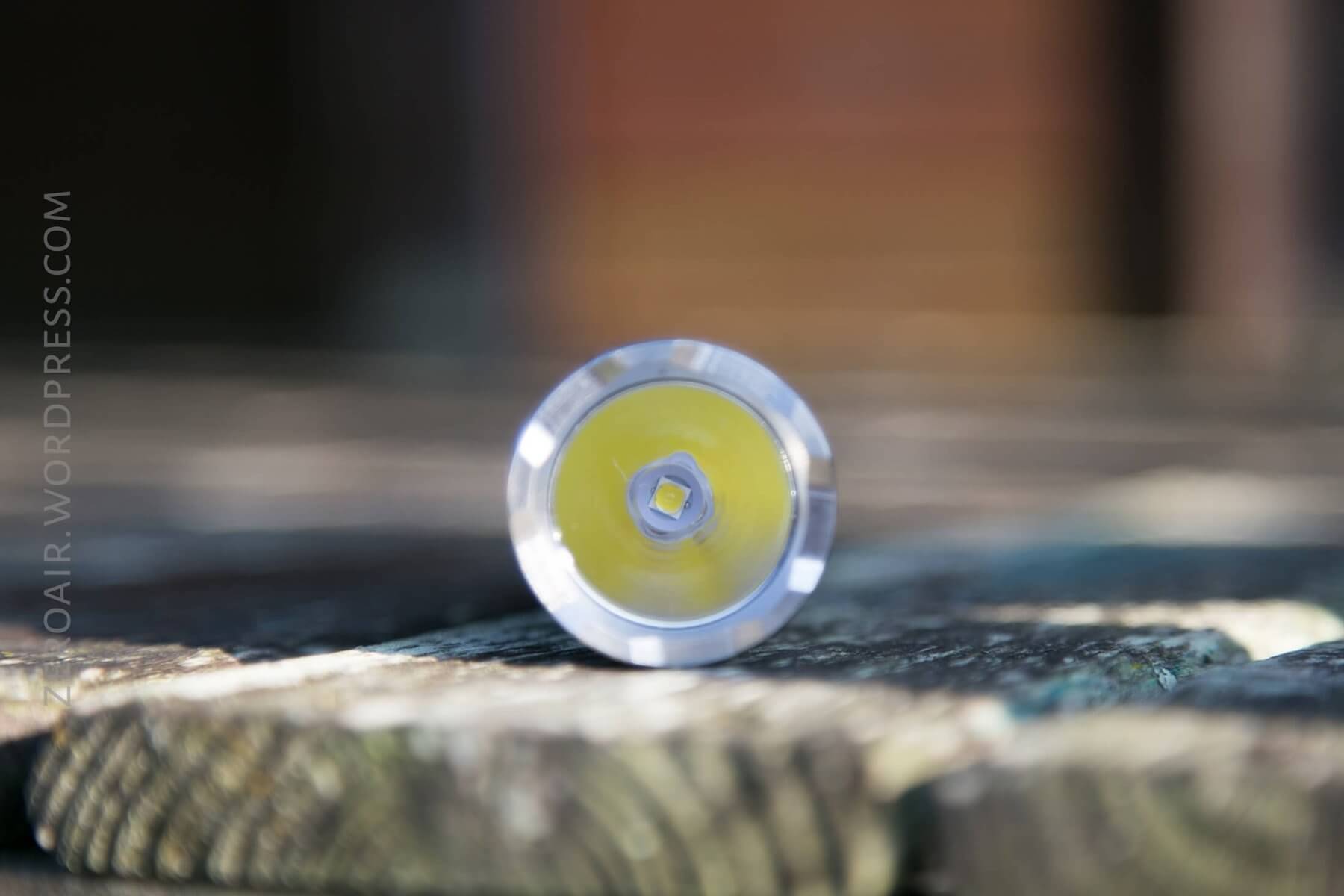 The emitter of choice is a Cree XP-L HD, V6. The reflector is smooth, but not perfectly smooth. It does make for a tight beam, though I measured it at only 144m throw.