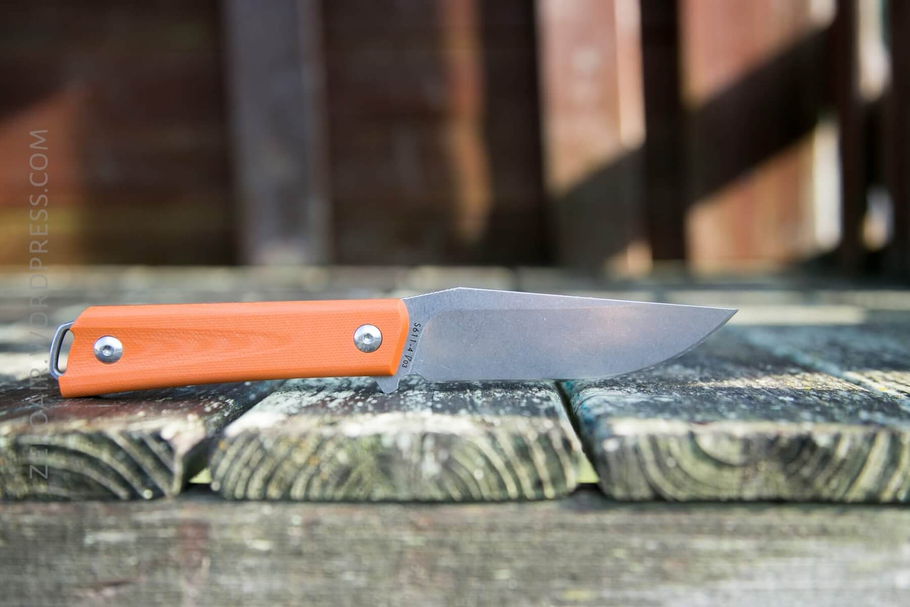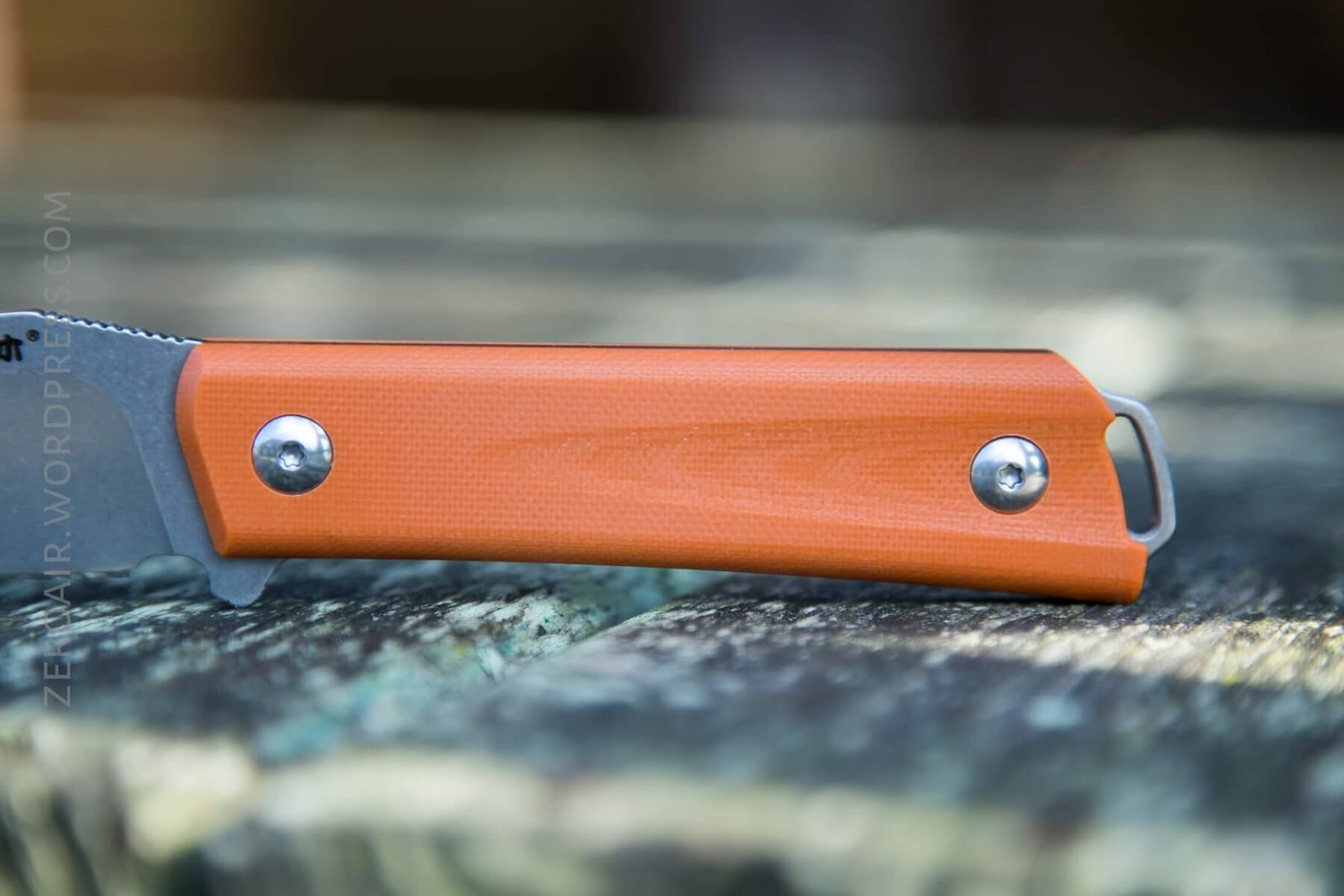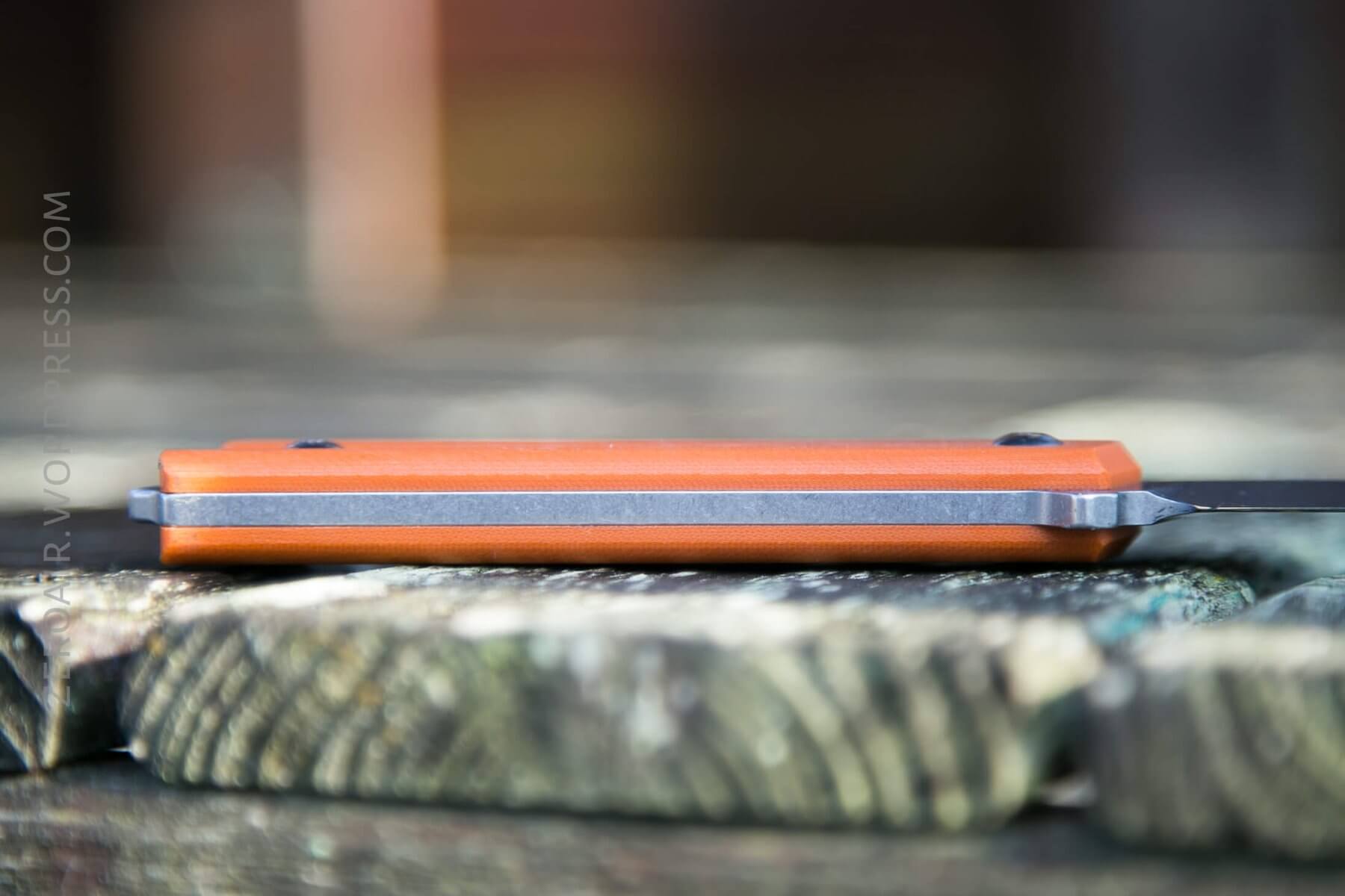 I’ll be honest, when I said “yes” to this knife I didn’t have high hopes. But in person, I really find it quite stunning. The scales are a very good muted orange. The blade has a nice stonewash finish. The screws are polished and add a nice accent.