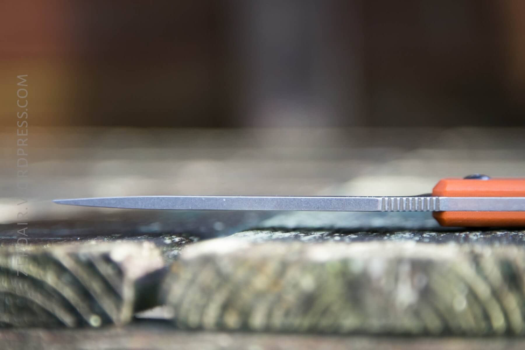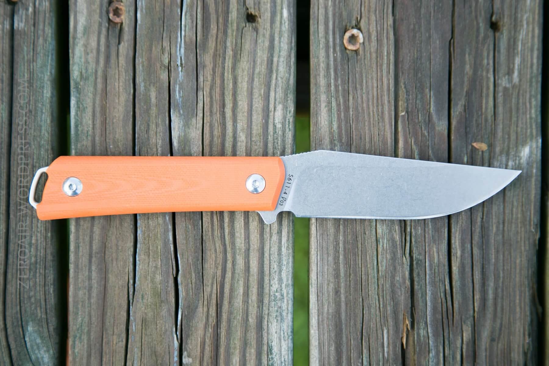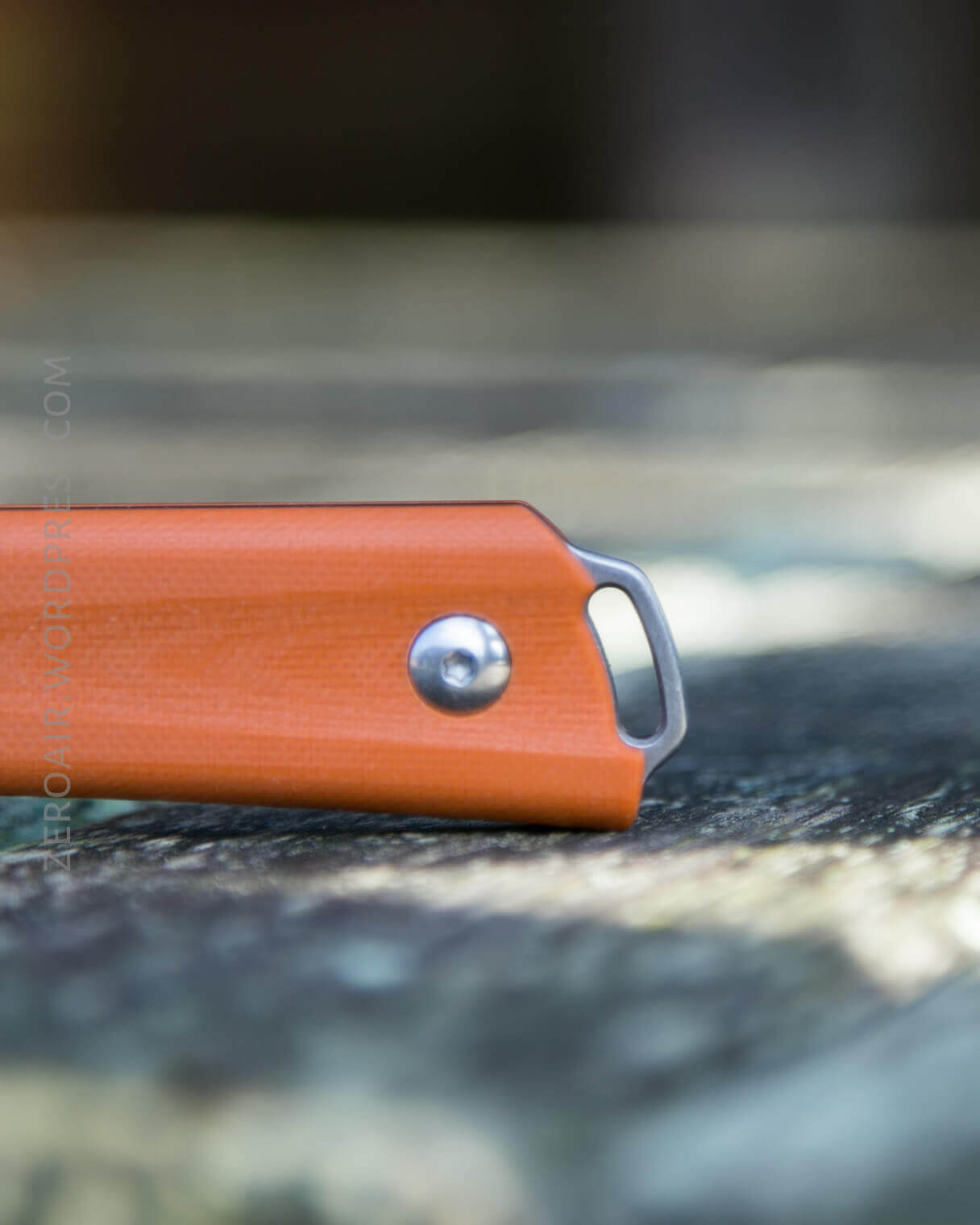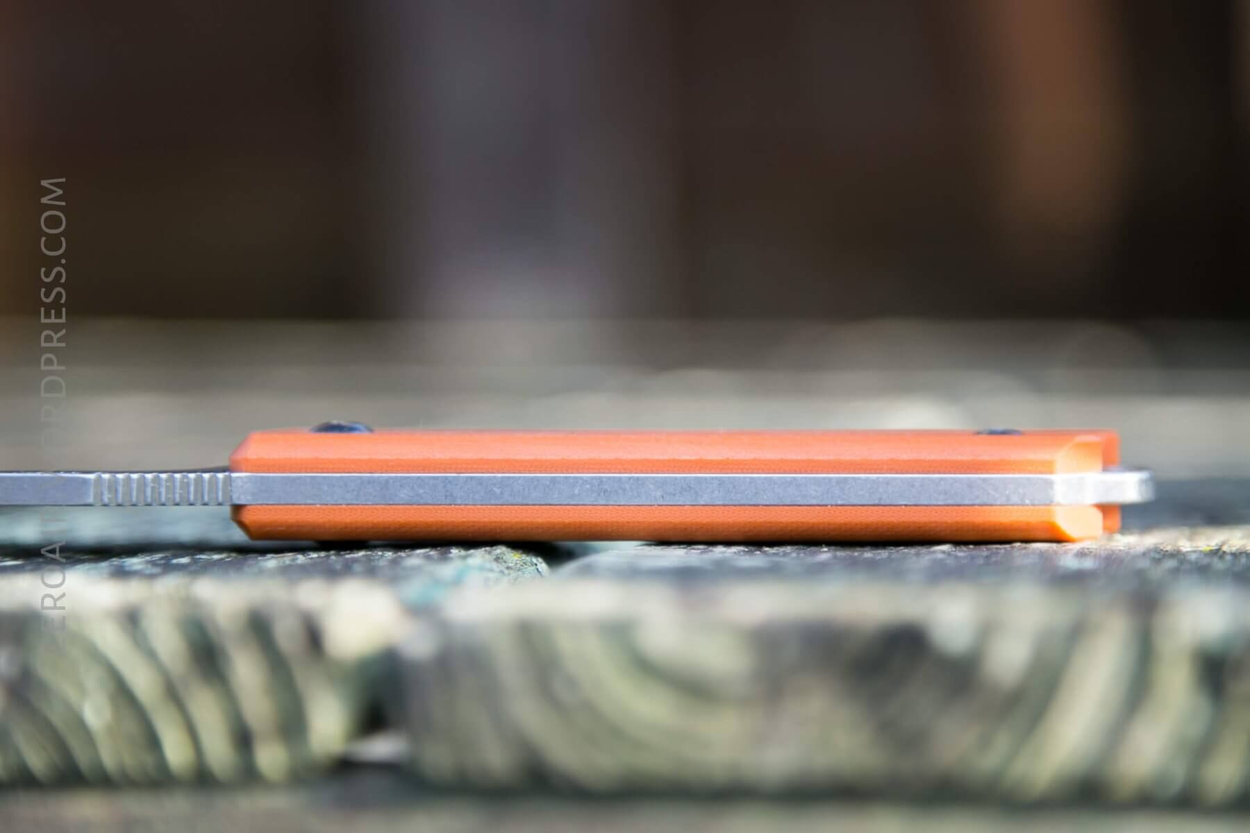 I’ll be honest, when I said “yes” to this knife I didn’t have high hopes. But in person, I really find it quite stunning. The scales are a very good muted orange. The blade has a nice stonewash finish. The screws are polished and add a nice accent.