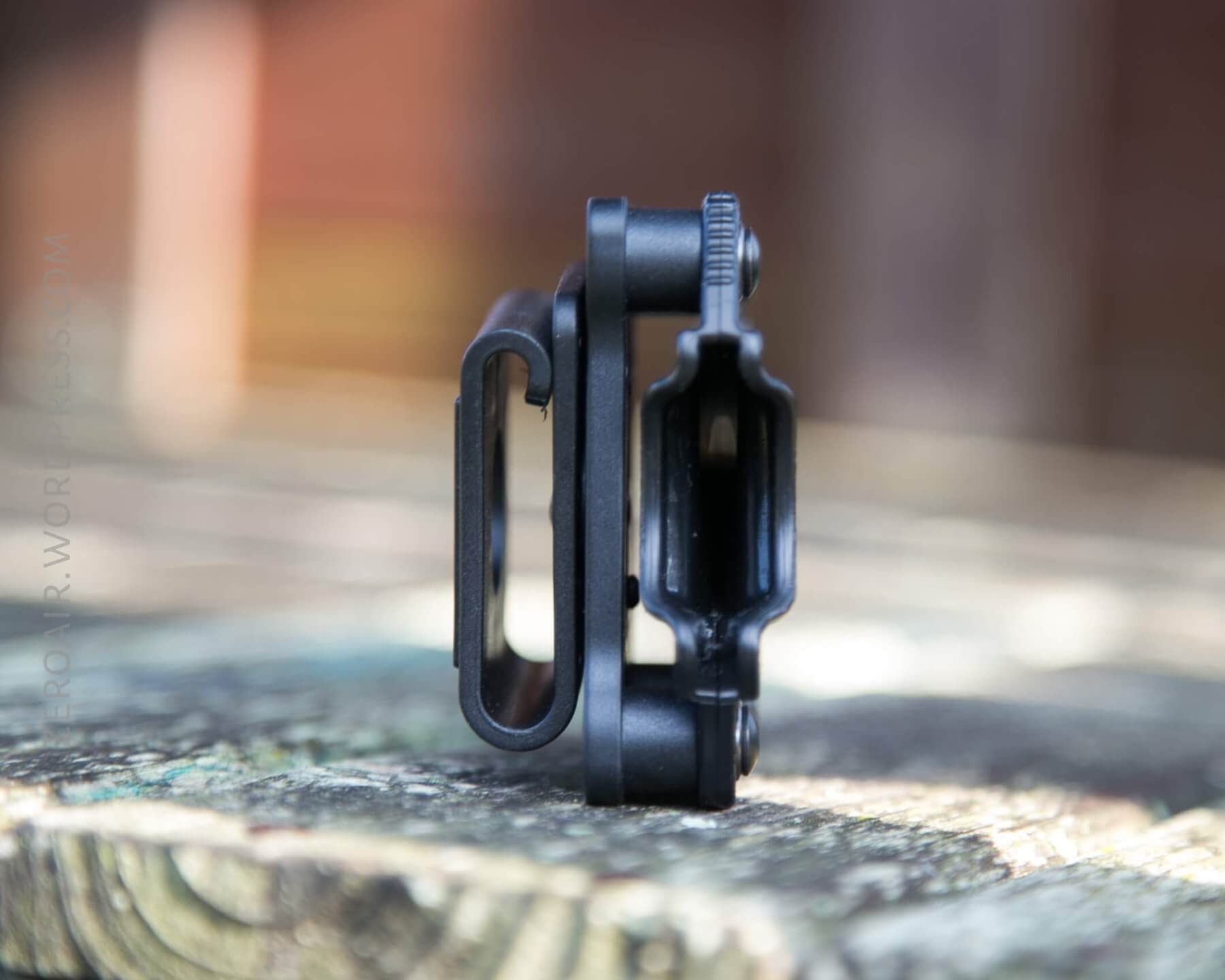 There’s a belt loop, which is on some standoffs, and the loop will rotate. There are a number of detents, so the knife can be held at a number of angles.