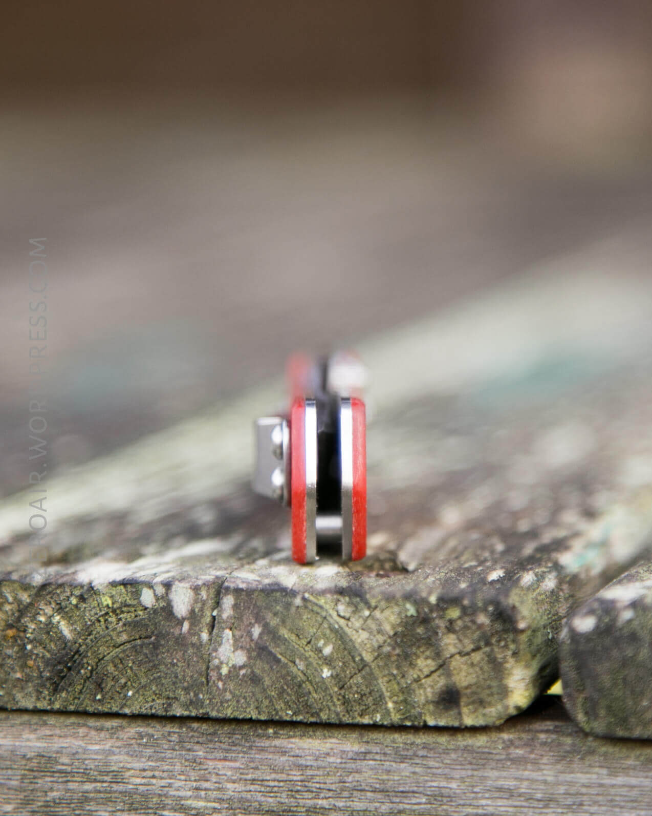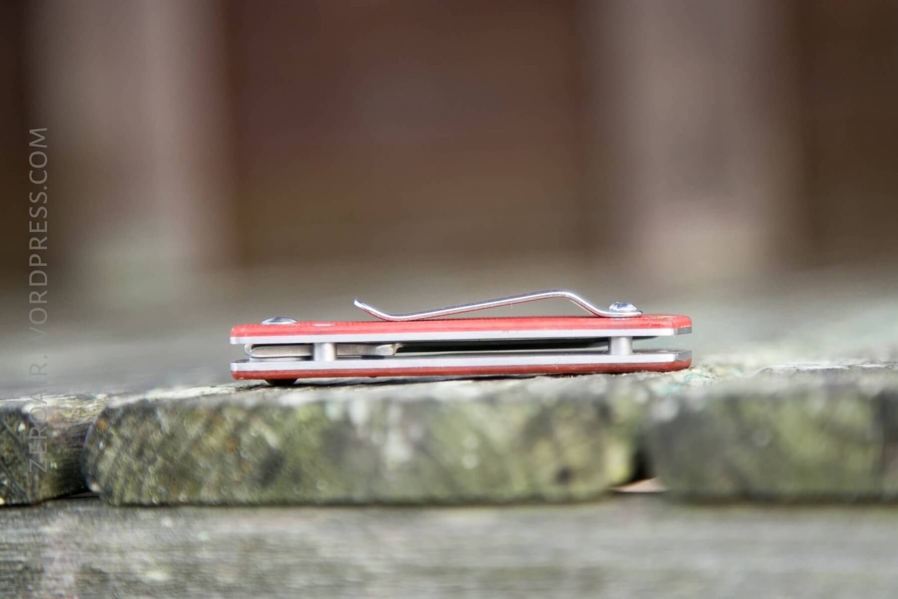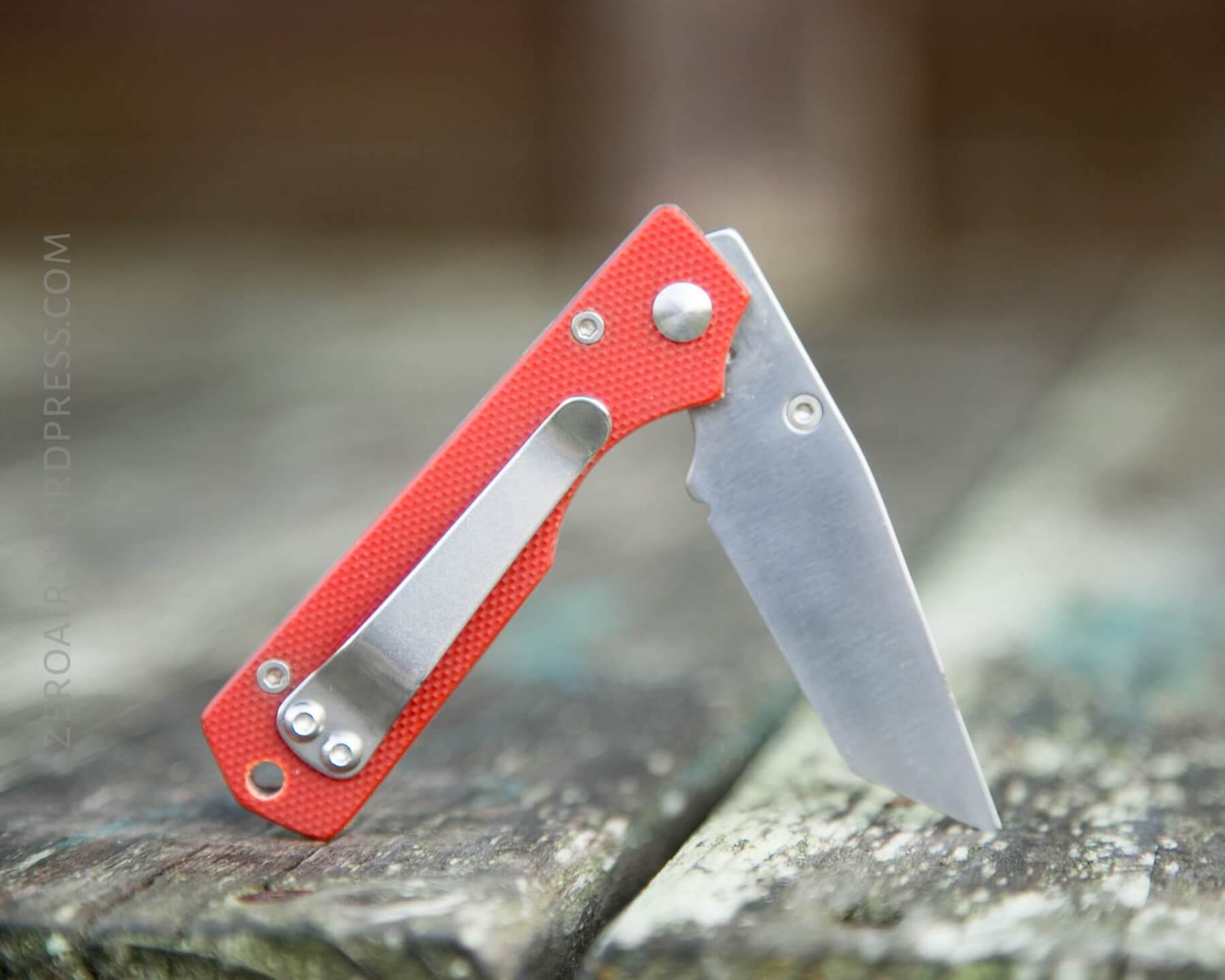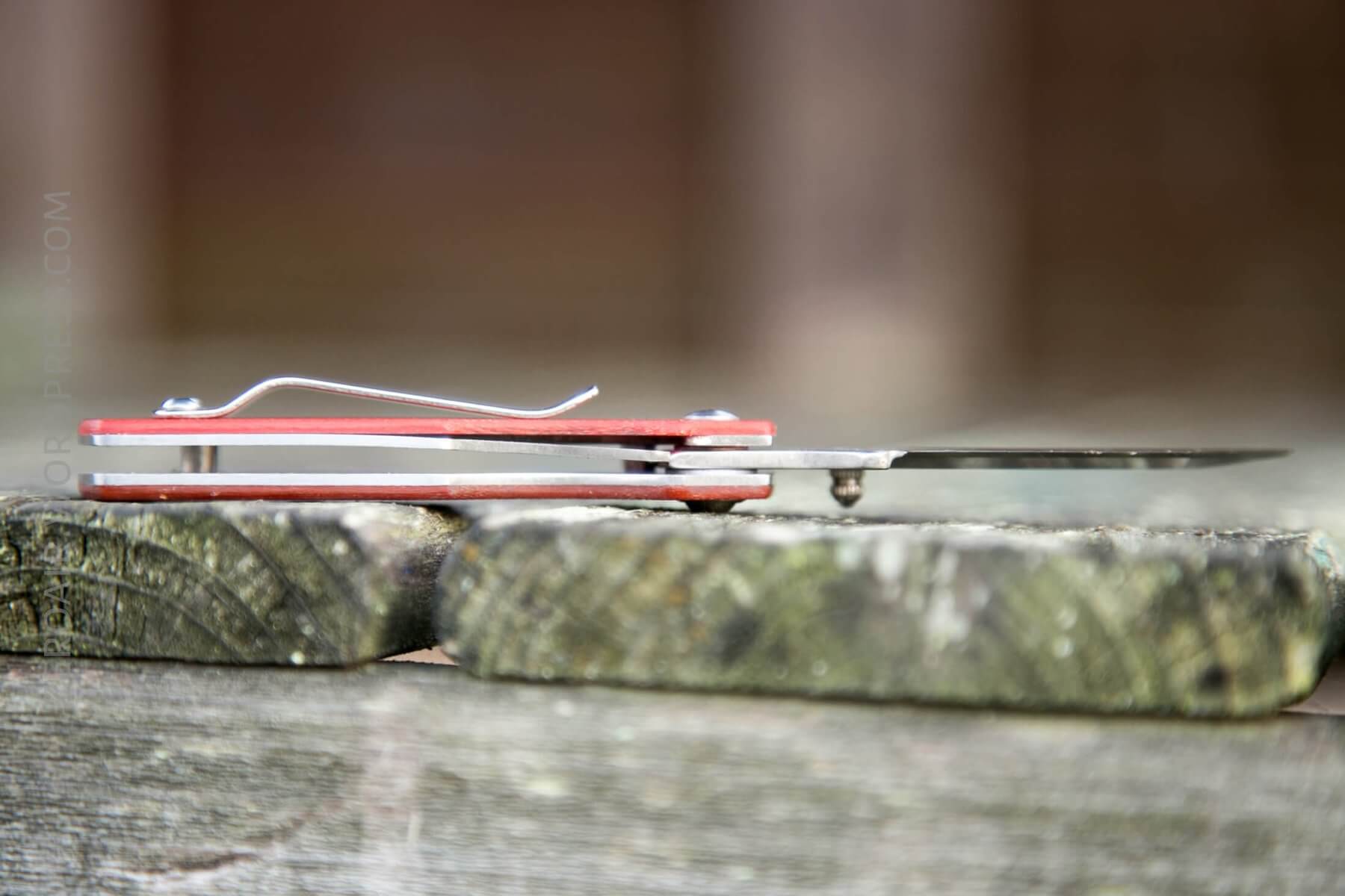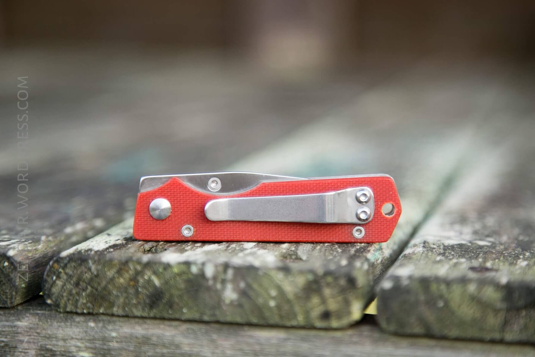 The knife opens by means of a small thumbstud. The stud is only one side, which makes this a very right-handed knife. The stud is screwed in though, and I believe can be unscrewed with pliers or an allen key (I couldn’t find the right, small size).