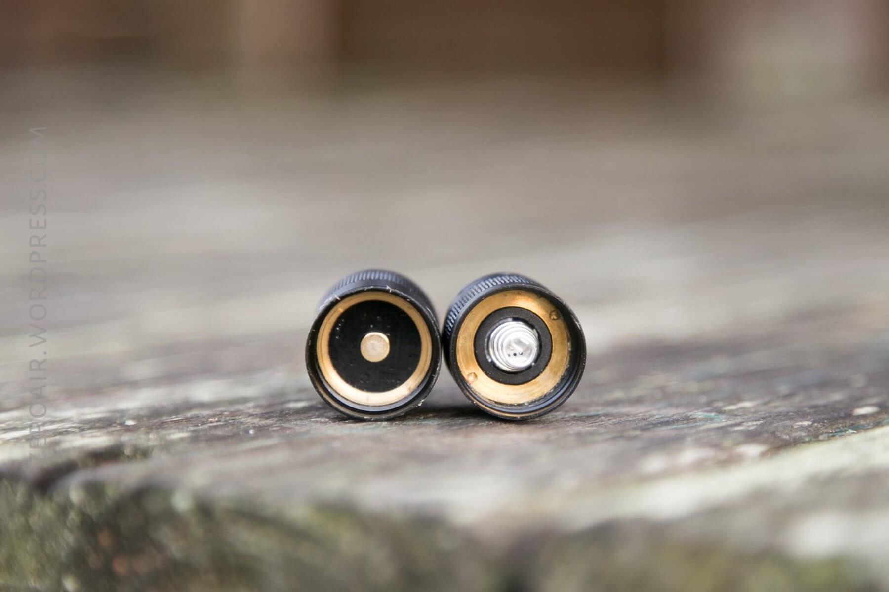 The head has a little brass button for contact, so should have no problem with flat top or button top cells. The tail has a moderately firm spring. The guts of both ends are held in place by brass retaining rings. While emitter swaps should be possible, I couldn’t find the right tool for unscrewing the ring. (My angled tweezers were the wrong angle!)