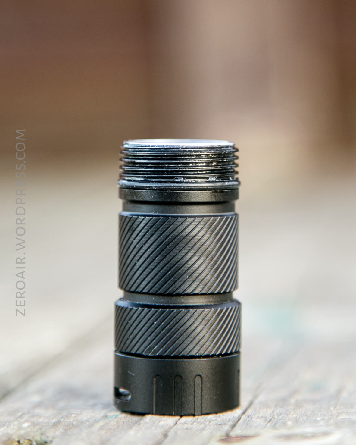 Strangely the body is definitely plenty big for a larger cell, but the cell tube has been bored carefully enough that the 16340 just fits.  This does mean that the body is 1) thicker than it has to be and 2) has plenty of mass for heat exchange and 3) the cell doesn’t rattle around in a bunch of empty space in there.   I am not bothered by a girthier light – it’s easy to imagine that the head on this light and another like the TO46R are the same, but accept different cell sizes.  Wouldn’t be the first time that’s been done!  That said, it’d be great if this was a 18350 tube, and if they want to include a 16340 sleeve, then that’s fine.