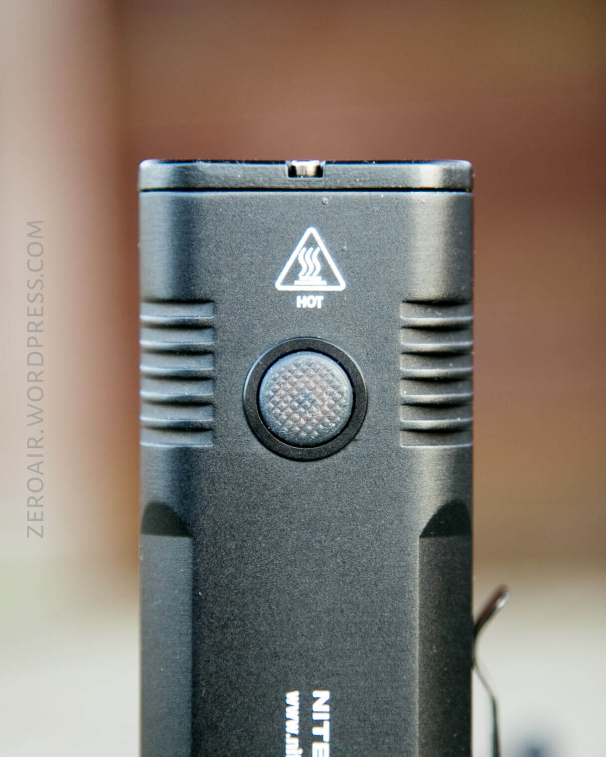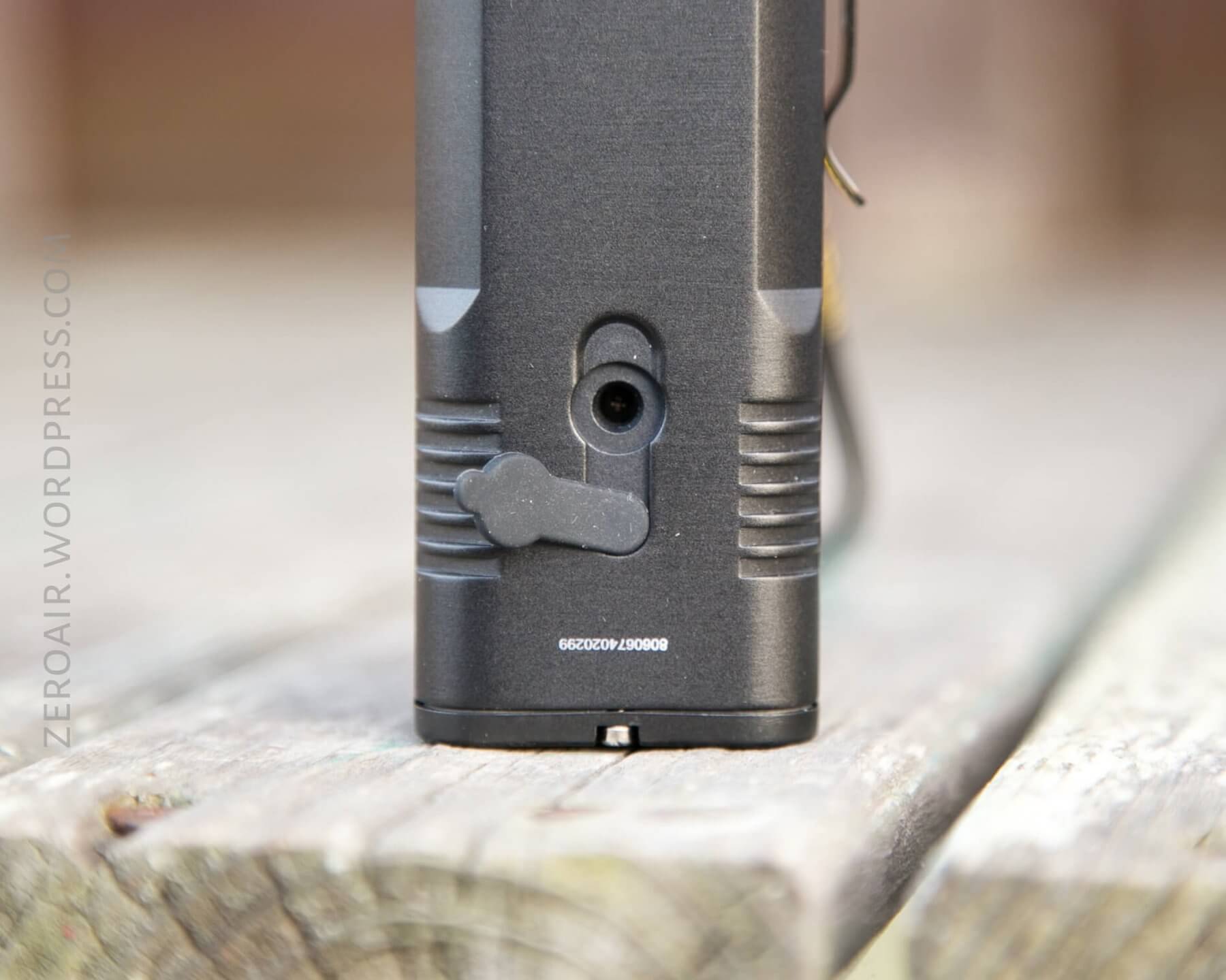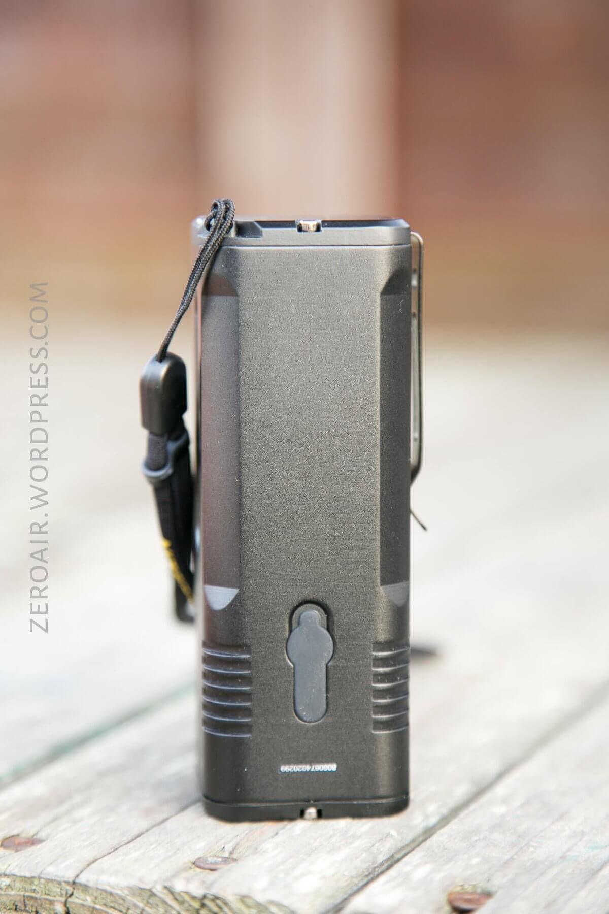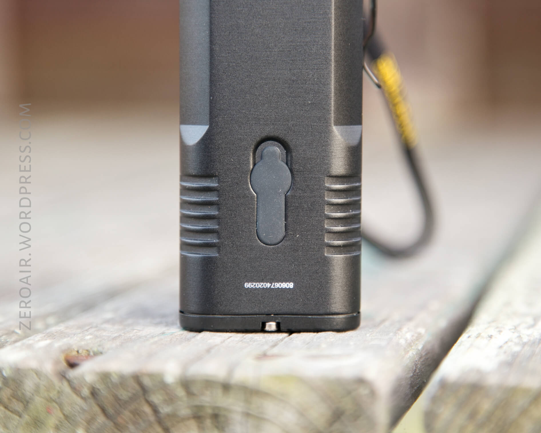 There’s a single e-switch on the head of this light. It’s a big, textured, indicating switch. The indicator has two blue LEDs. I quite like this switch. It’s a double-action, responsive clicky switch. It’s exactly like the switch on the Nitecore MH23. I liked the switch then, and I still like it now.