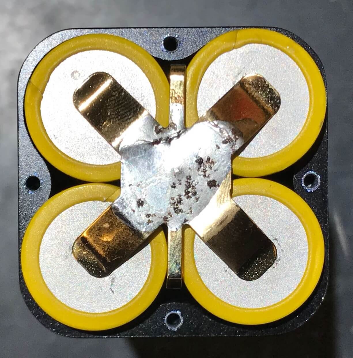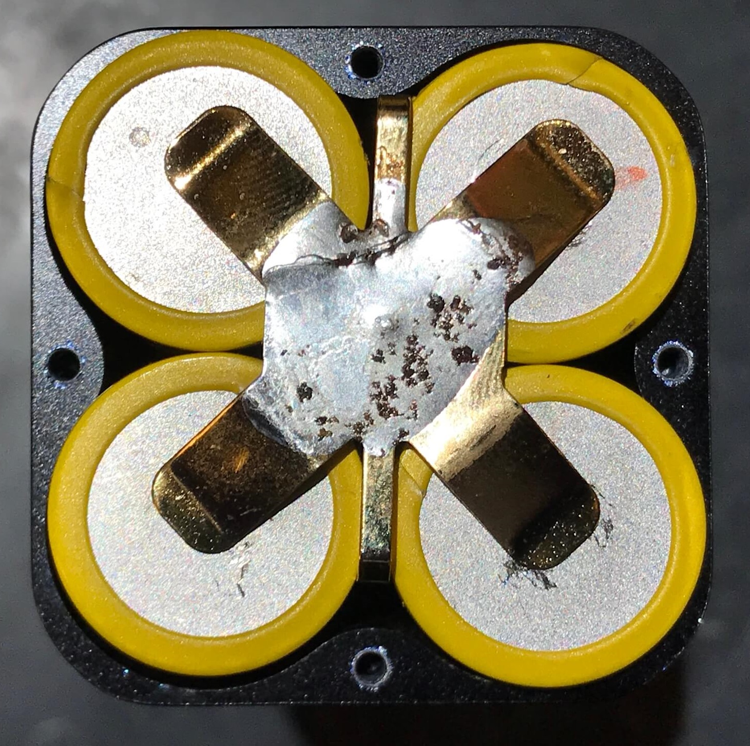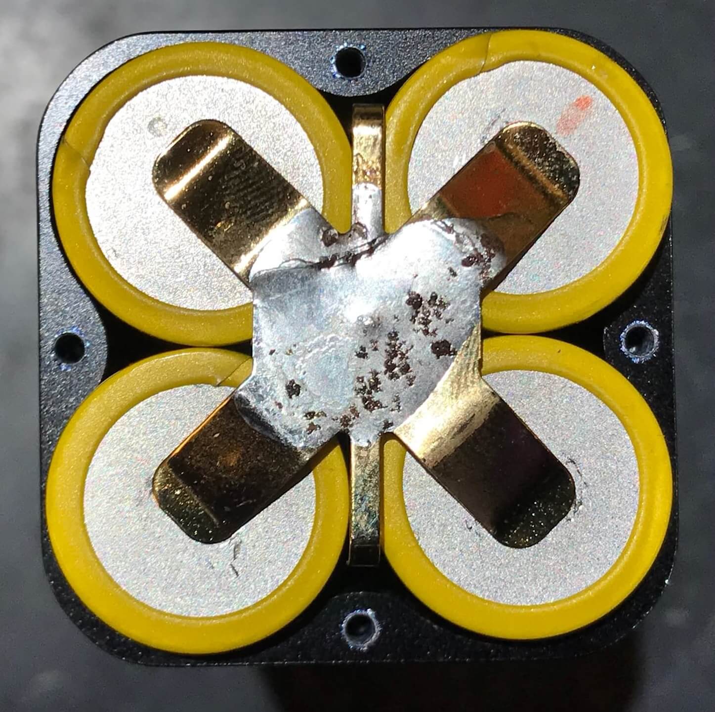 Here’s what you reveal. There are four 18650s being held in place by this unusual pressure-mounted holder. Contrary to what you might expect, the cathode here is not soldered. The cathode is touched by that brass piece, and that’s soldered together in the center. From there, a rod runs between all 4 cells to the other end of the light.