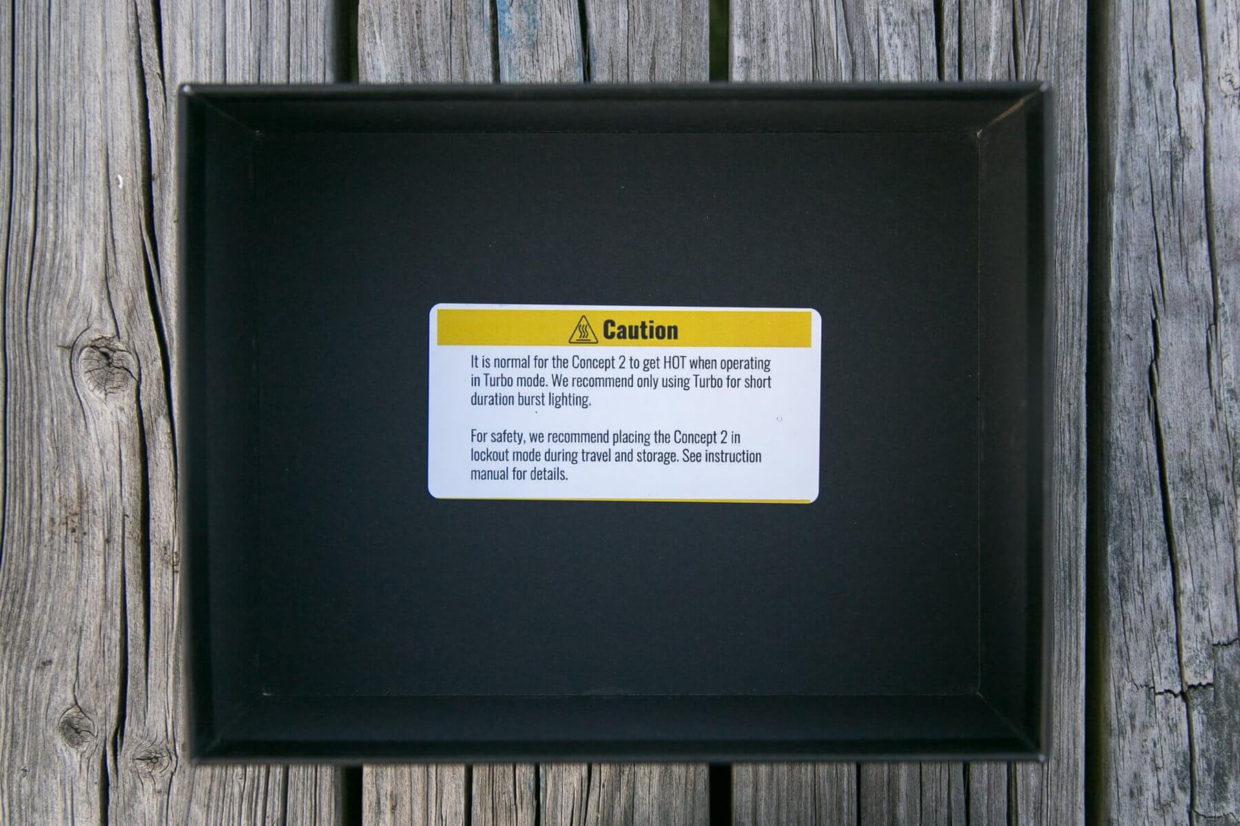 The package for the Concept 2 is quite nice! It’s a slip-fit cardboard box, and there are no reliefs for gripping to separate the parts. However, the coating on the box is such that they slide apart fairly easily. The image you see below on the cover of the box is actually embossed! My package had two warnings about the light getting hot.