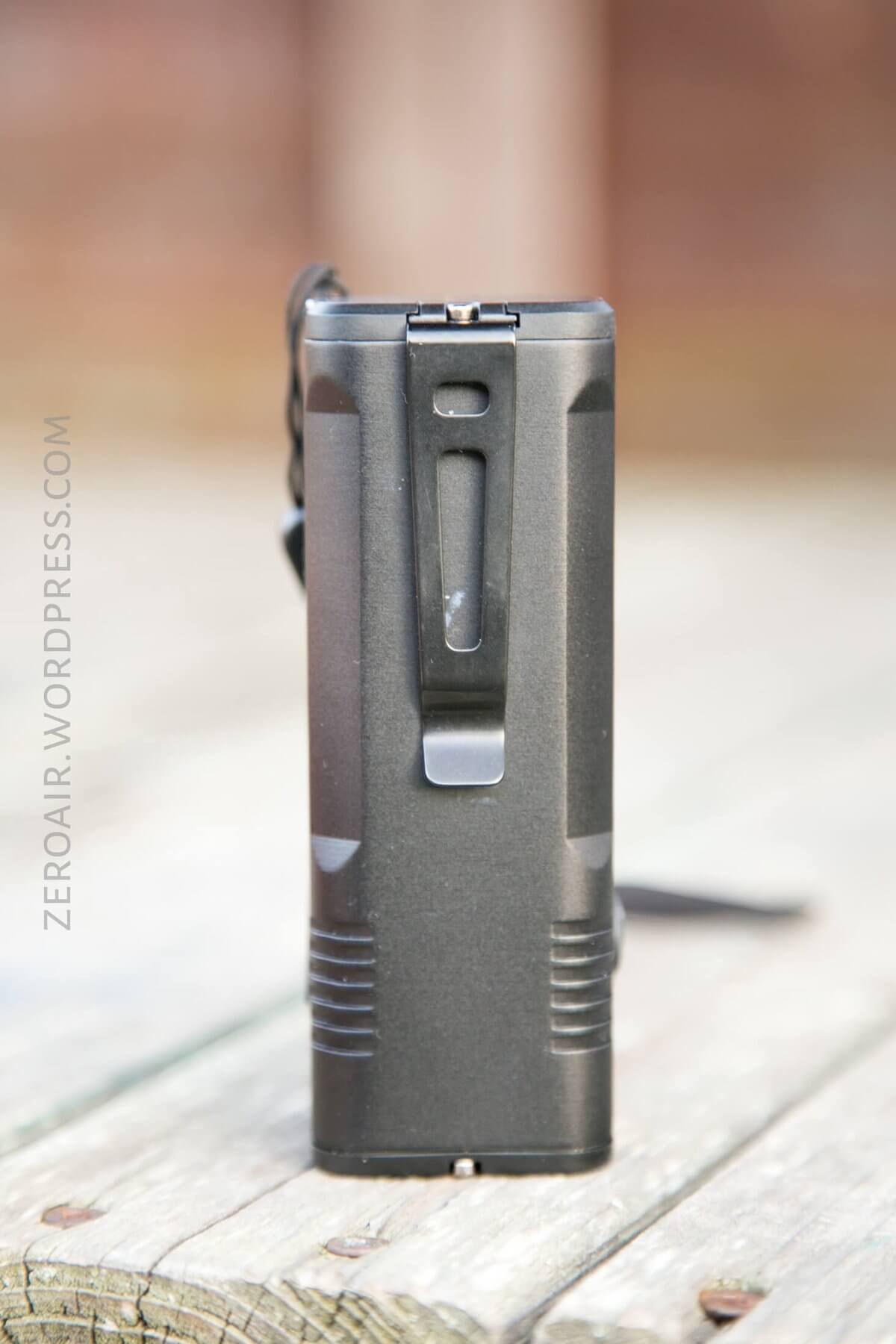 First is the pocket clip. Or more likely, the belt clip. This is a beefy, springy clip, held in place by one of the 4 screws on the tailcap. It’s removable – just one screw and a steel plate hold it in place. It’s quite slim, too. Perfect for a belt. It doesn’t overly expose the light. That said, you’d have to really want to wear this light on the belt for it to work. It’s 348g, after all.