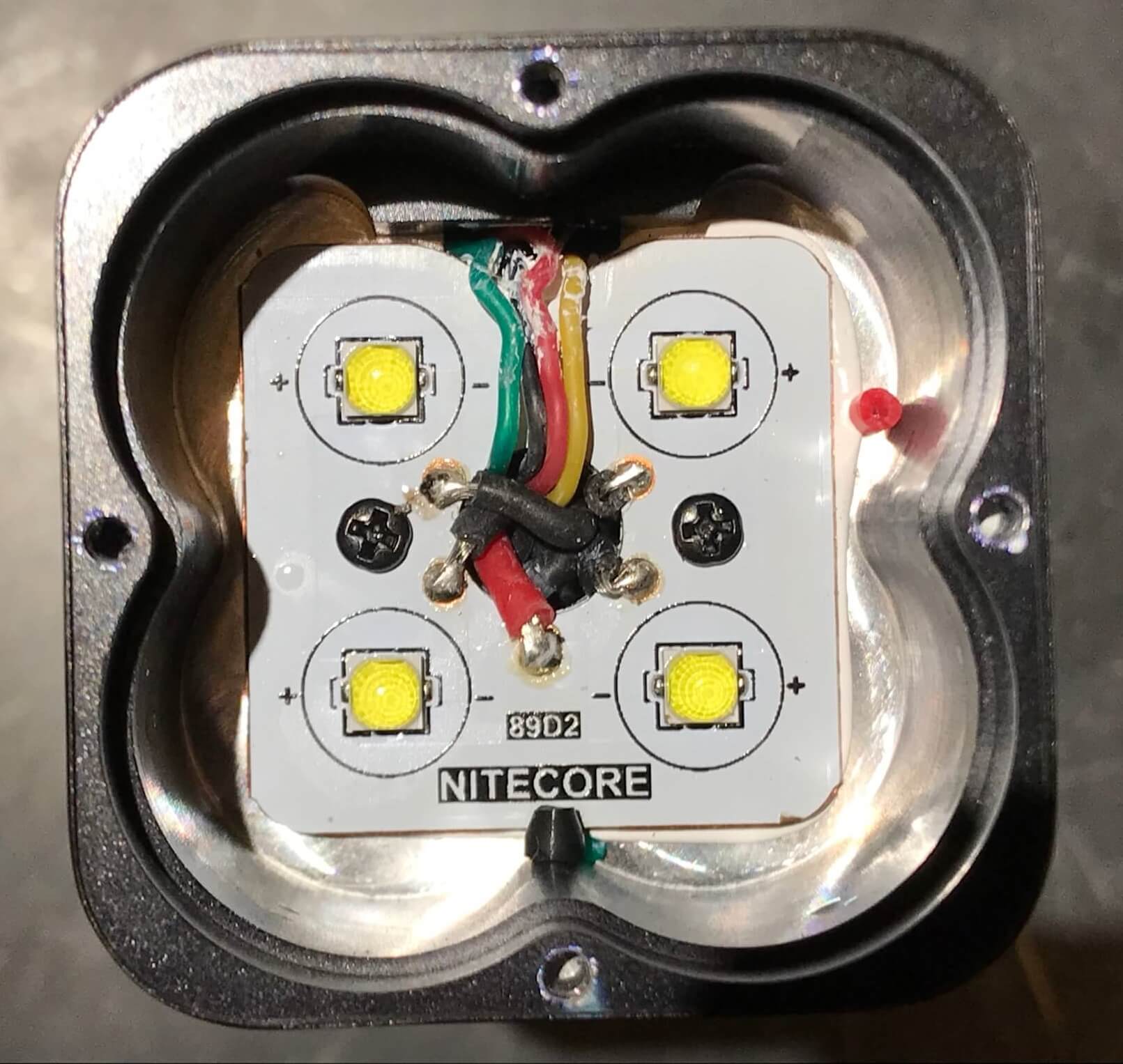 And then you’ve revealed the MCPCB. It’s a square job, with what looks like individually rounded corners (ie, rounded off just for this light). It’s held in place by a bunnnnnch of wires. The green/black/red/yellow combo goes to the switch. The MCPCB is held in place on the light’s shelf by two screws.