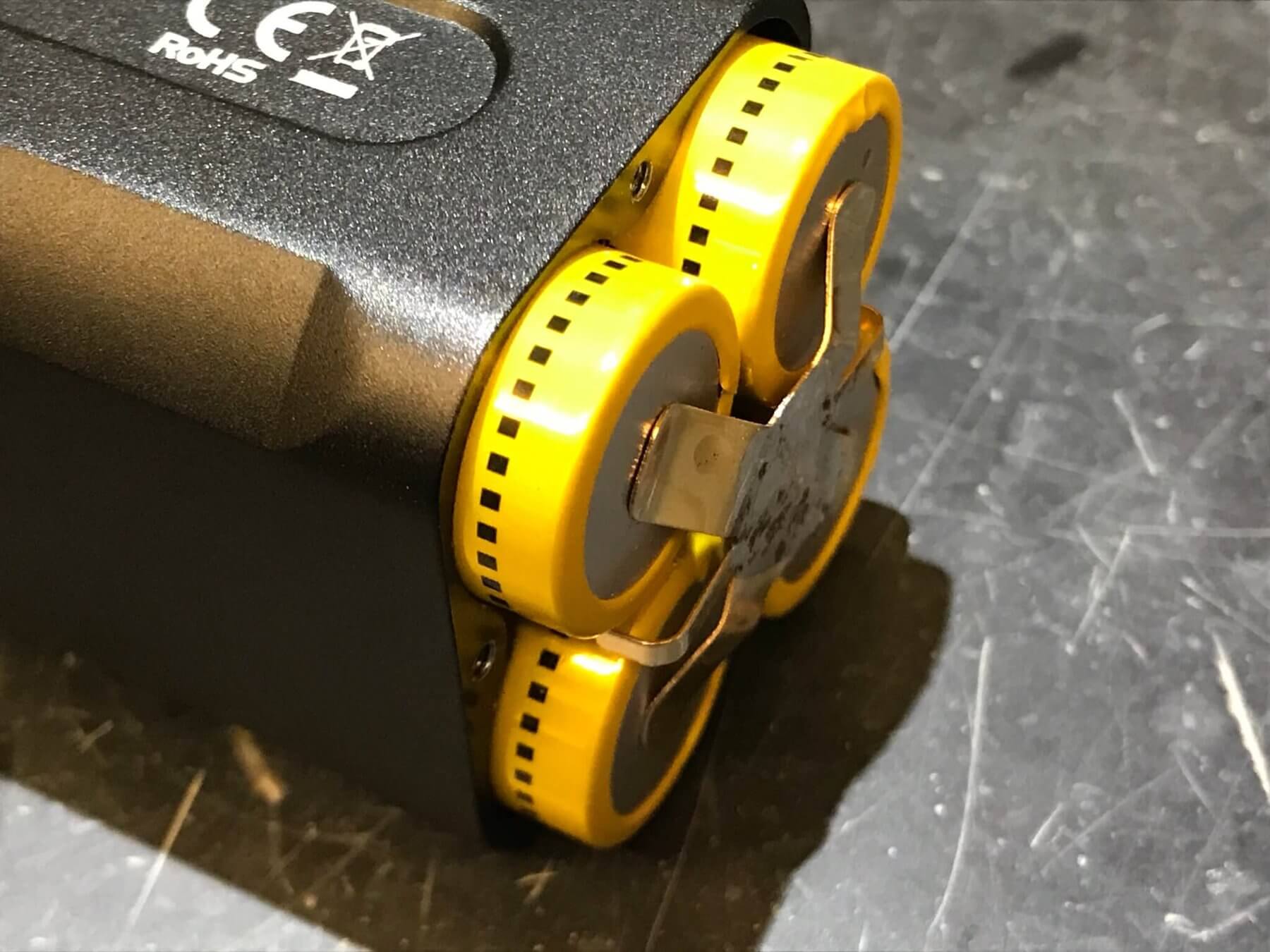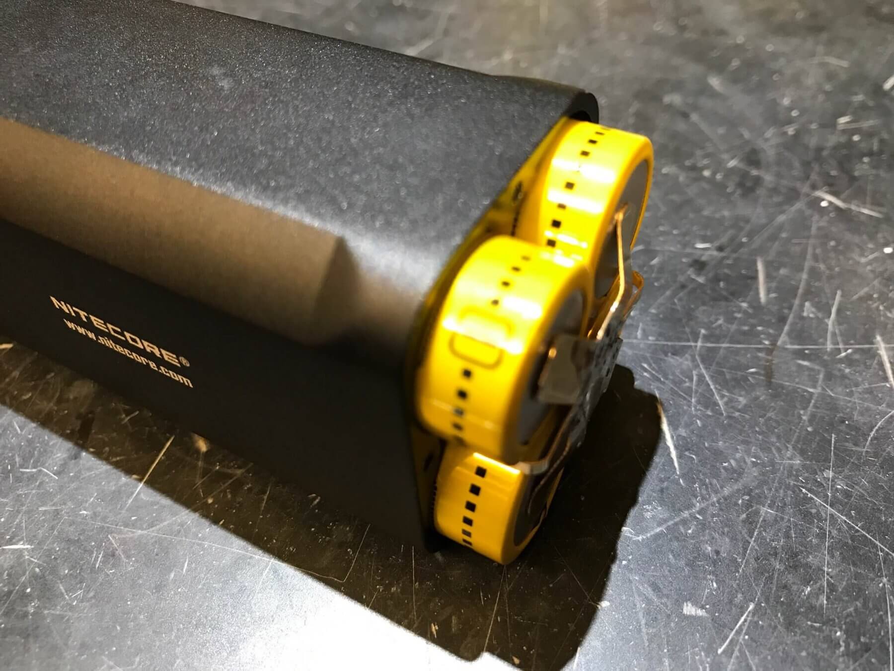 This whole unit isn’t user-serviceable. See below how far the cells were willing to budge, and that’s with considerable effort. My suspicion is that the anode of these cells is soldered to wires. That’s the kind of give the cells have. Nitecore has a bunch of cell types, and they all have this Cohiba-style line around the bottom. That at least tells us the cell is high quality – the “worst” possibility is a 2100mAh 30A cell. The best is a 3100mAh 35A cell. Whatever it is, these cells provide plenty of juice for the light.