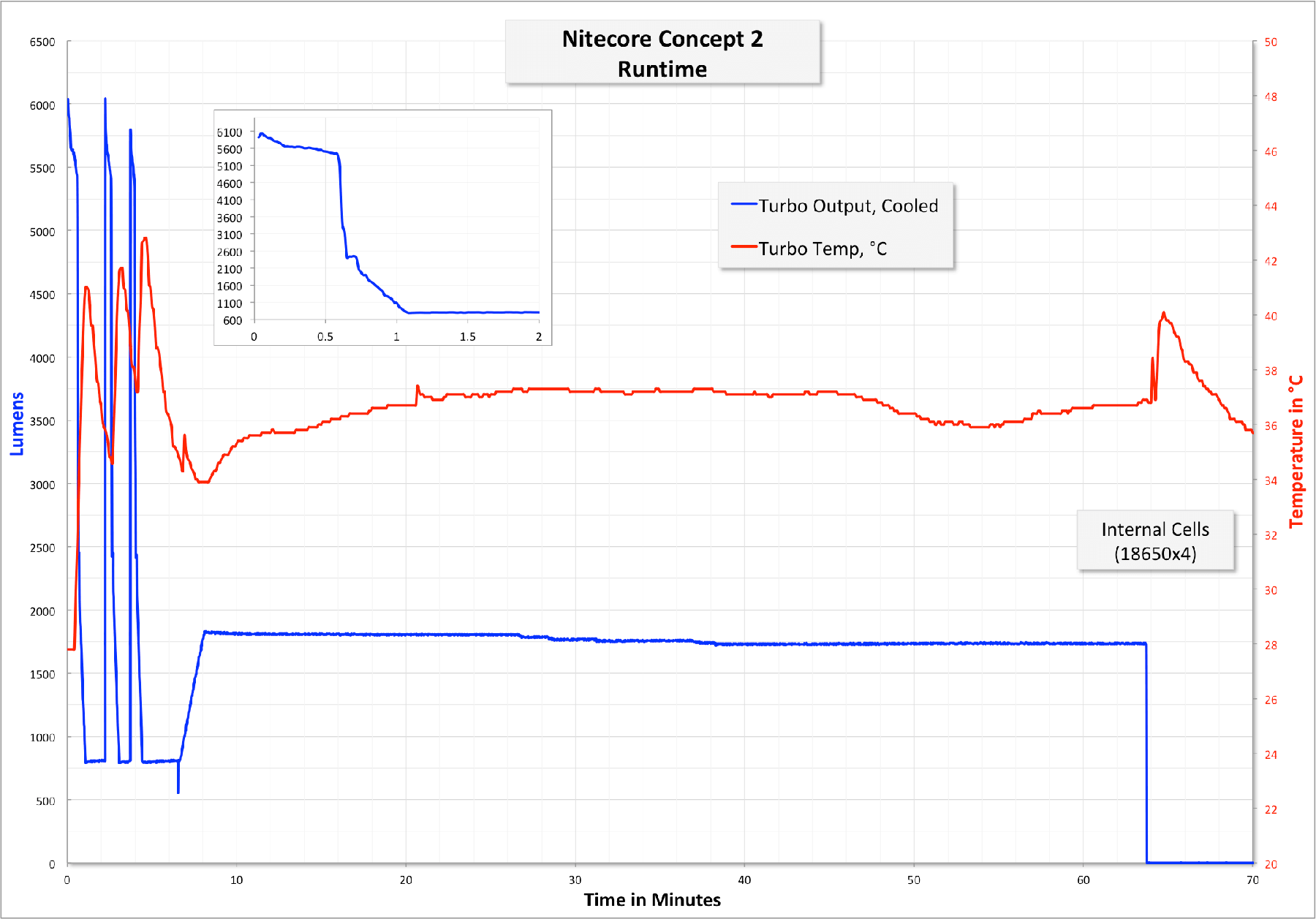 I performed a runtime on Turbo. When I initially played with the light, I thought “man, this gets hot,” but in truth, it doesn’t really get that hot. And doesn’t stay that hot, either. It’s throttled quickly. Notably, though, (as seen below), it is possible to hit turbo again, and the output is nearly equal to the startup output. But also note that the stepdown is much quicker in those cases. Once the temperature comes back down, the light will step up. This step up, as you can see from the second graph, is really stepping into the same stepdown High goes into mode.