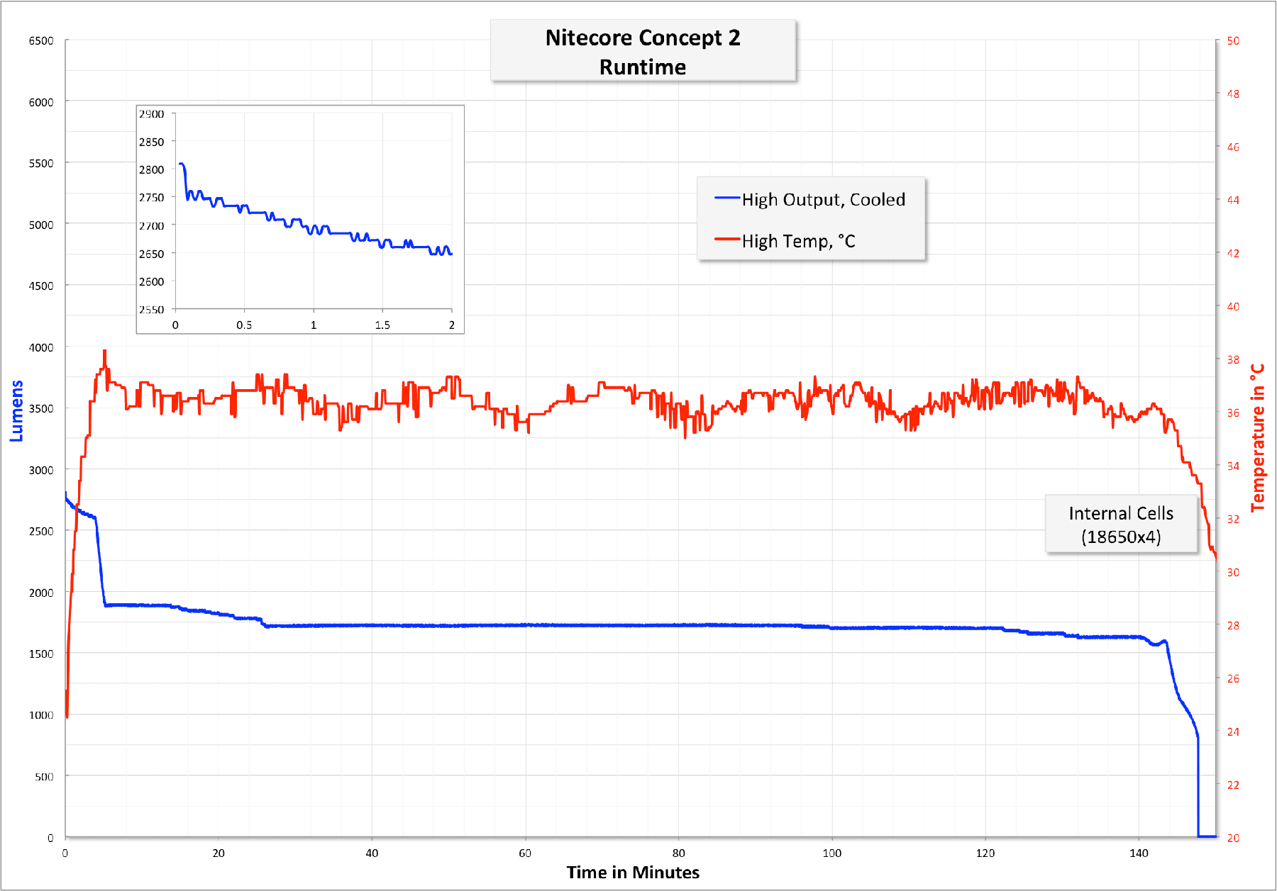 Below is a runtime of High. High actually has a bit of a thermal throttle too, but lasts much longer at High than Turbo does at Turbo. Also, the stepdown isn’t into “Medium” (which is around 1000 lumens), nor is it actually “High” (which should be around 2500 lumens). But either way, it’s very steady for the remainder of the runtime.