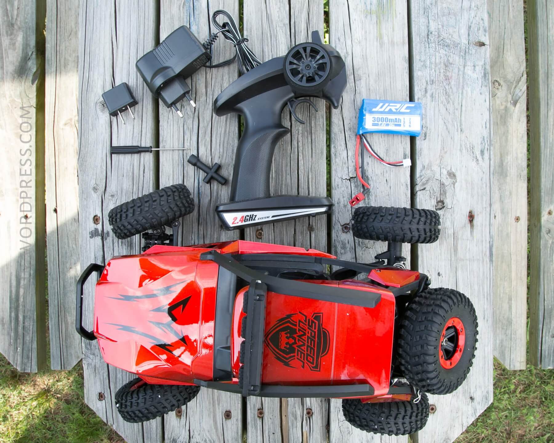 This RC car is a 1:12 scale vehicle. The official dimensions are: 18cm tall, 23cm wide, and 38.5cm long. The car weighs 1609g. While the car might be small enough for playing in small yards, it’s quite fast, too! So bear that in mind.