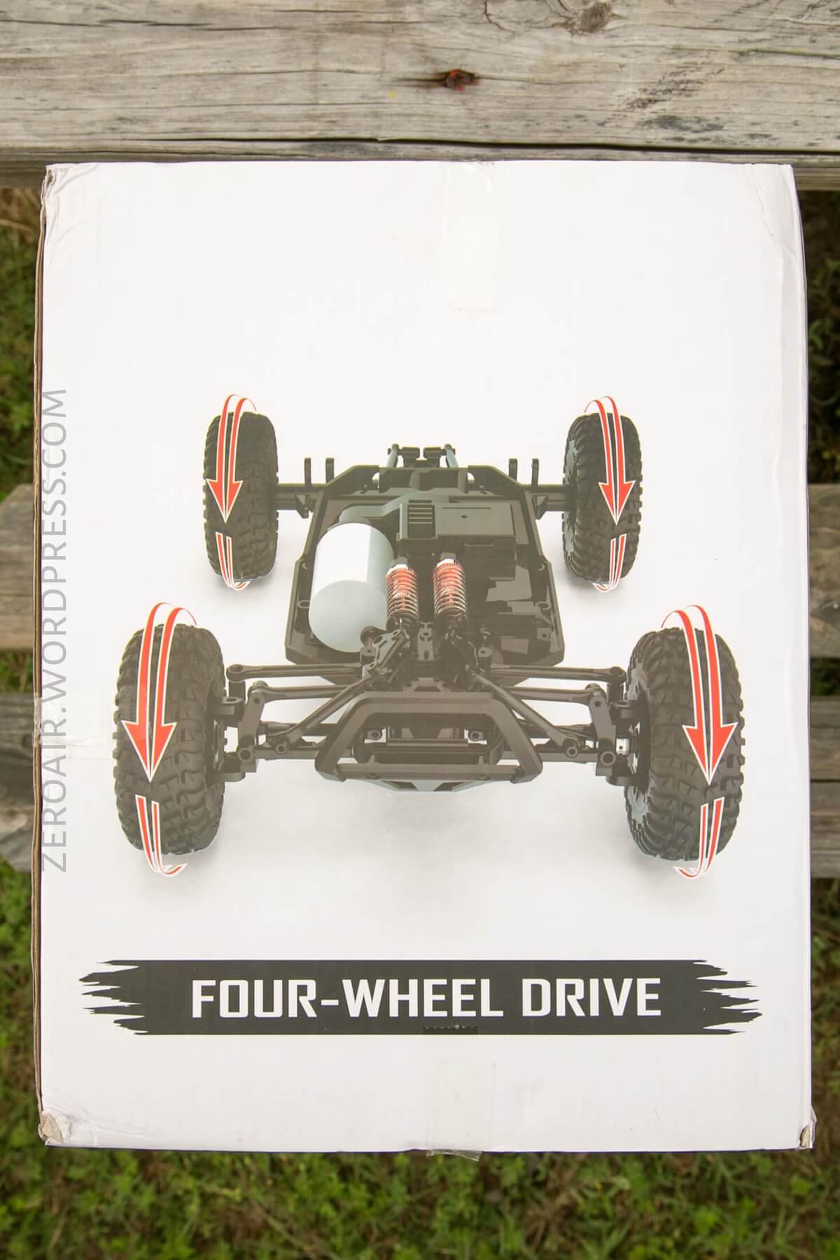 The box is a simple cardboard but highly printed. There’s a photo of the red colorway on one side, and the blue colorway on the other. One short end has the undercarriage, and on the other end, the controller.