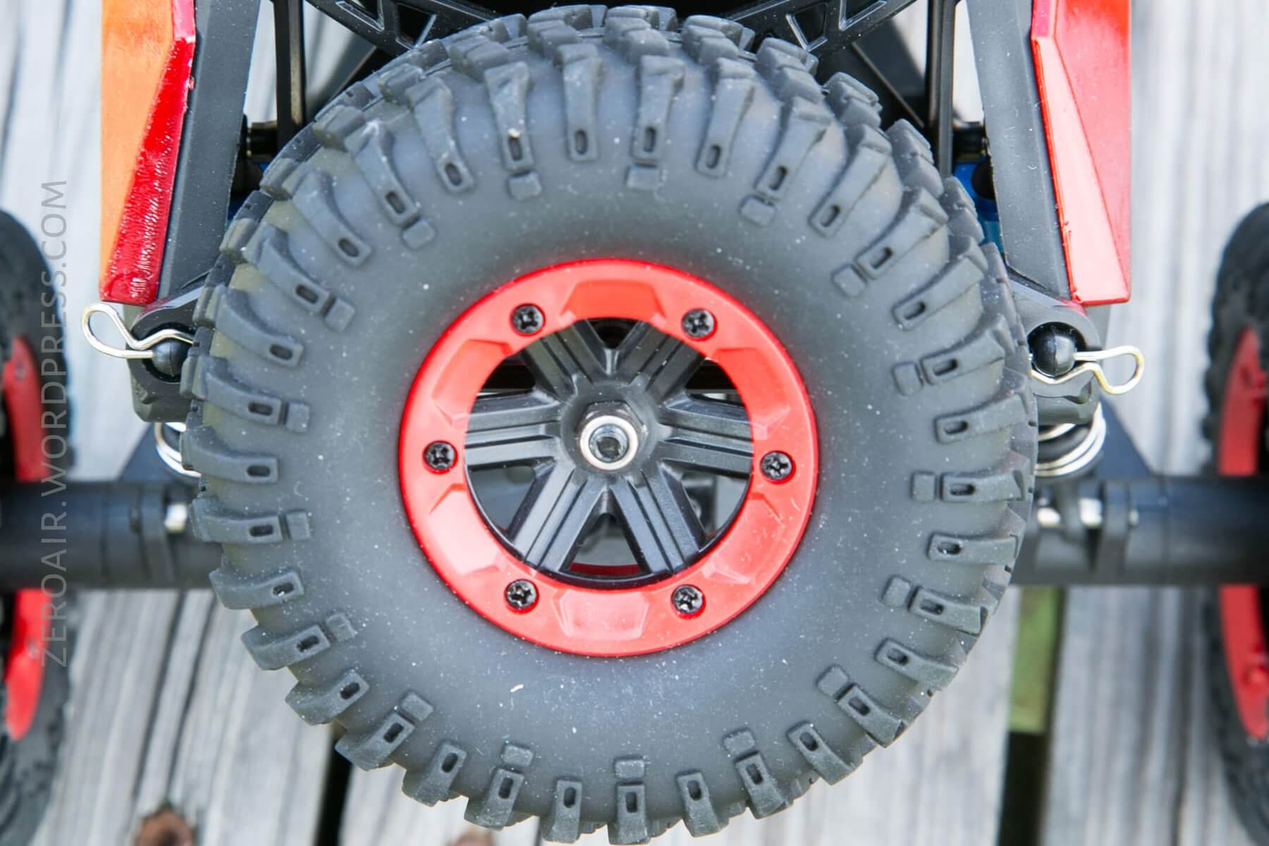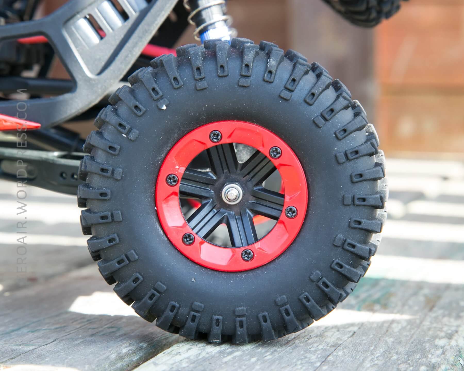 The big tires are knobby and quite squishy. They provide good traction on flat surfaces, and often so much grip that the car will topple over. This is not to say that the car is top-heavy – its weight rides nicely and low.