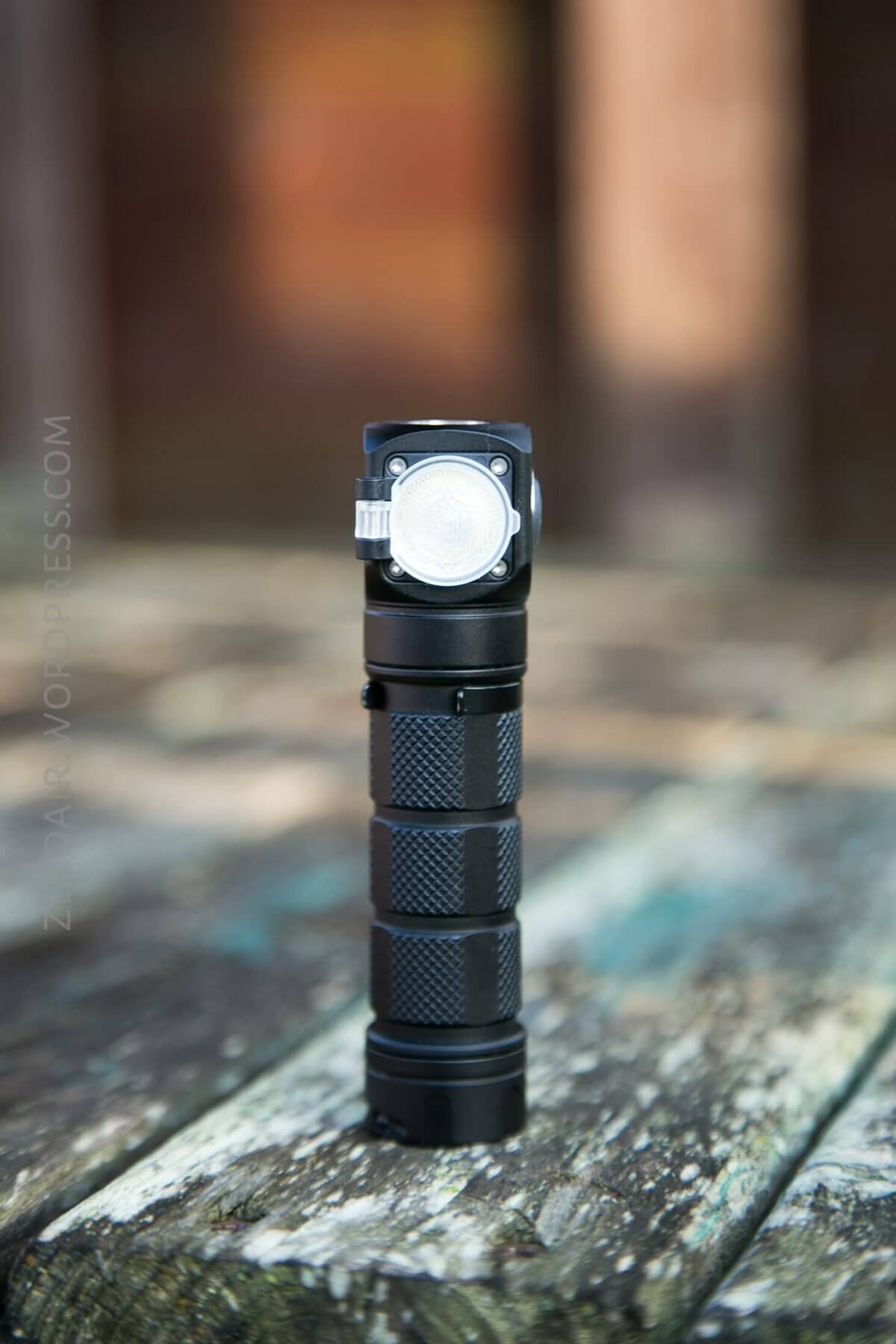 Skilhunt puts a Cree XM-L2 U4 emitter in this light. This particular light, the “F” version, has a very lightly orange-peel reflector and a hinged optic that acts as a diffuser.