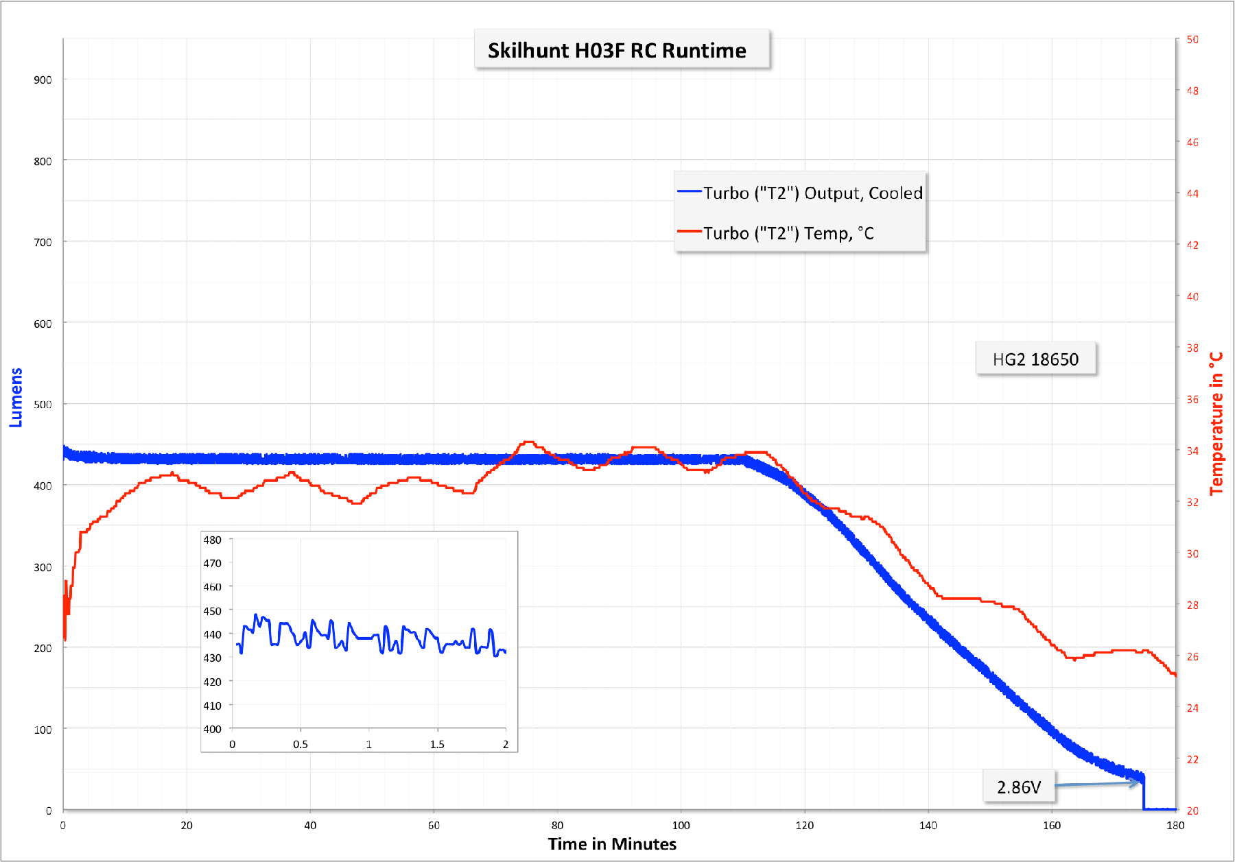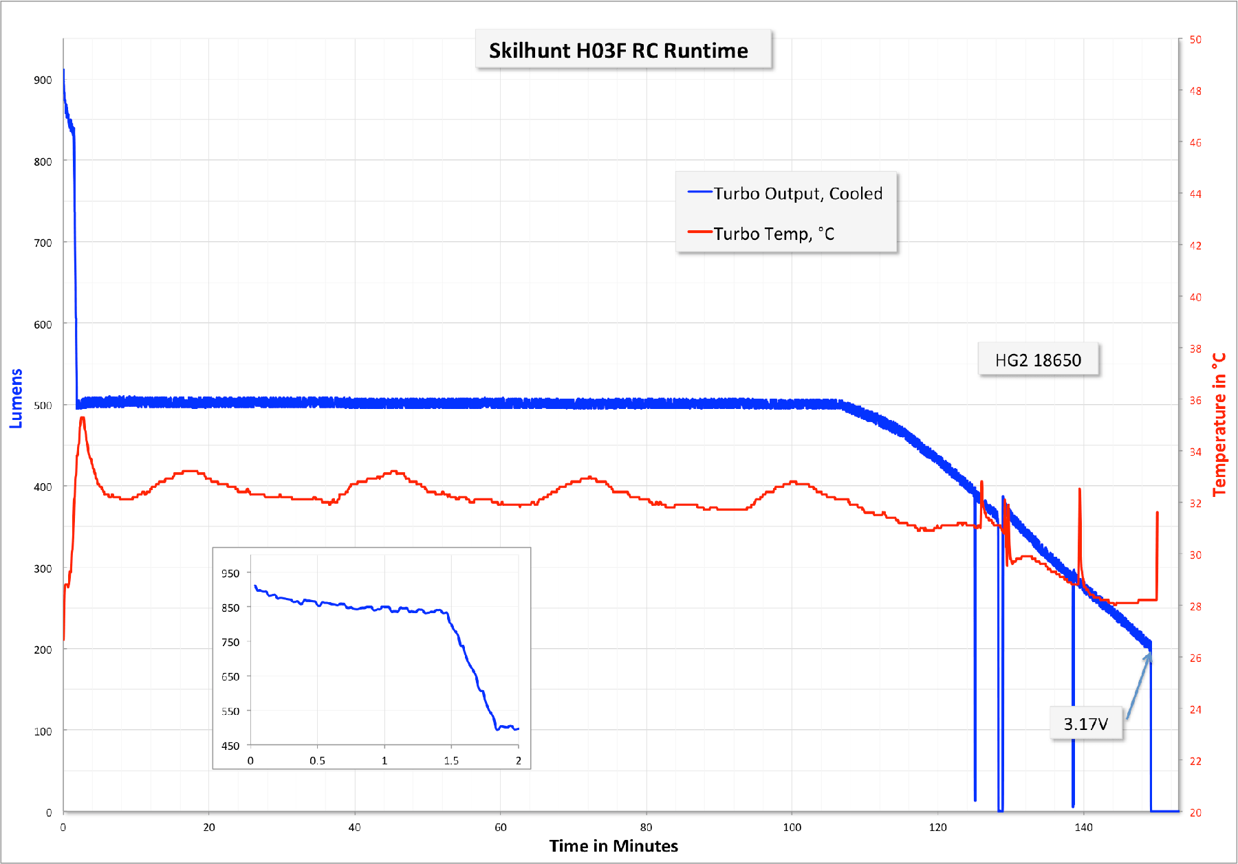 Here’s a runtime on Turbo. That is, T1, the highest mode. Stepdown is at a respectable 1.5 minutes, but doesn’t seem to be related to temperature (as the light never heated up past 36°C. The stepdown is approximately to T2, around 500 lumens. I didn’t perform any turbo resets in this run, but I did check the cell voltage a few times late in the run.