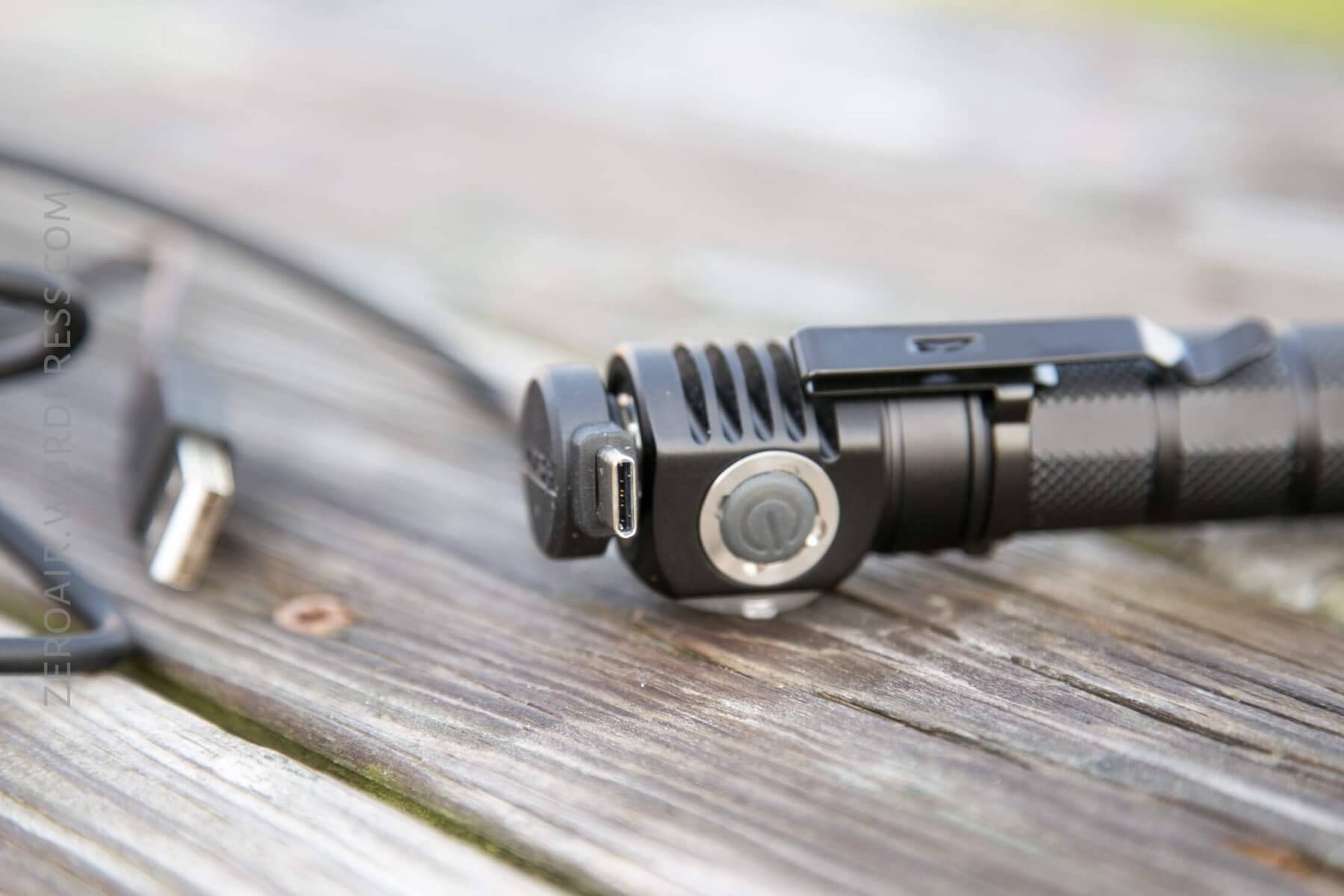 Here’s the big update on this light! onboard charging. This is done by means of a proprietary connection on the head. Skilhunt includes a cable, too, of course. The cable has a red and blue LED to indicate charge status.