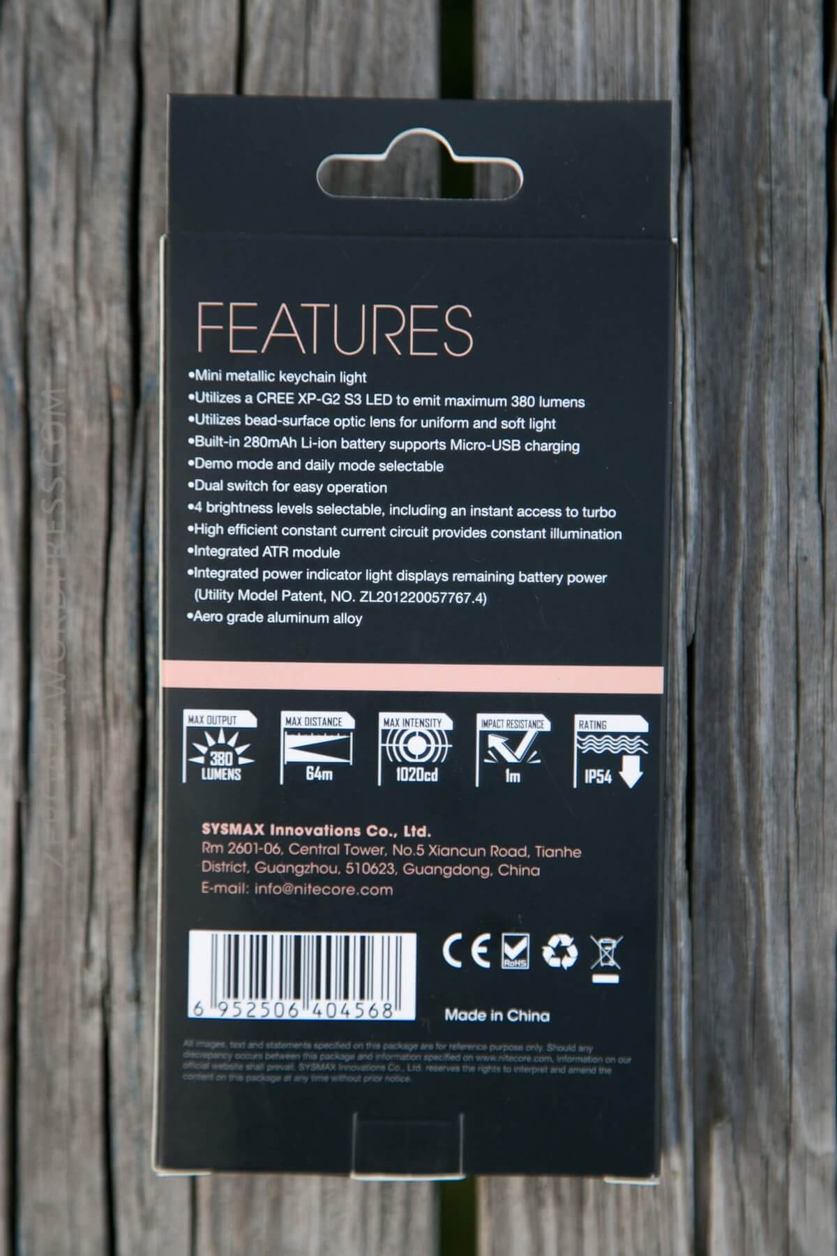 This special edition copper light warrants Nitecore to stray from their normal black and yellow package! This is a slim package, with nice photos and a feature list.