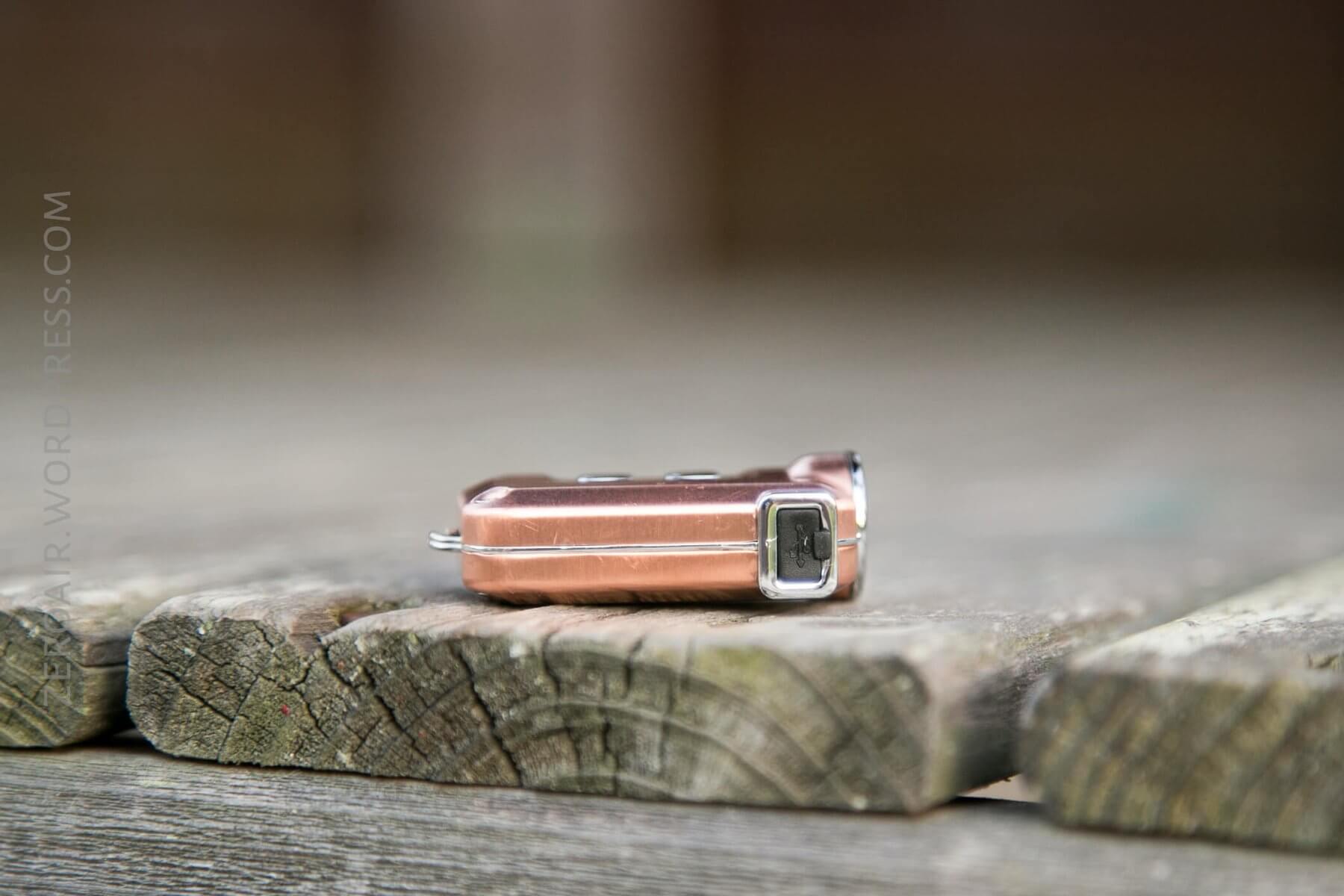 The body of this light is copper and in two parts. That’s always been my biggest complaint with the other small lights like this: that the body is two parts, requiring a seal between the parts, and around the micro-USB port, the seals were questionable. The TINI is much more solidly constructed. The halves match up perfectly, and everything is completely snug (to be fair, the TIP is like this too, but I do feel like the TINI is more solid).