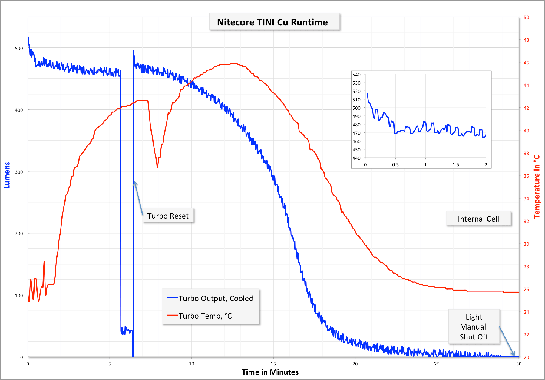 Though the light only claims 380 lumens, I measured it much higher than that, at around 480 (30s). I don’t think this is due to the difference in material or heat managing ability of the copper.