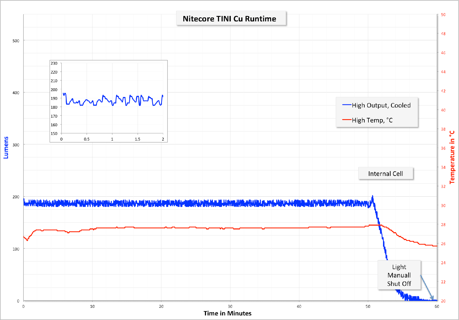 TINI Cu has a built-in internal cell, which is claimed to be 280mAh. Nitecore has been accurate in the past with their other similar models. This isn’t a user-replaceable battery.