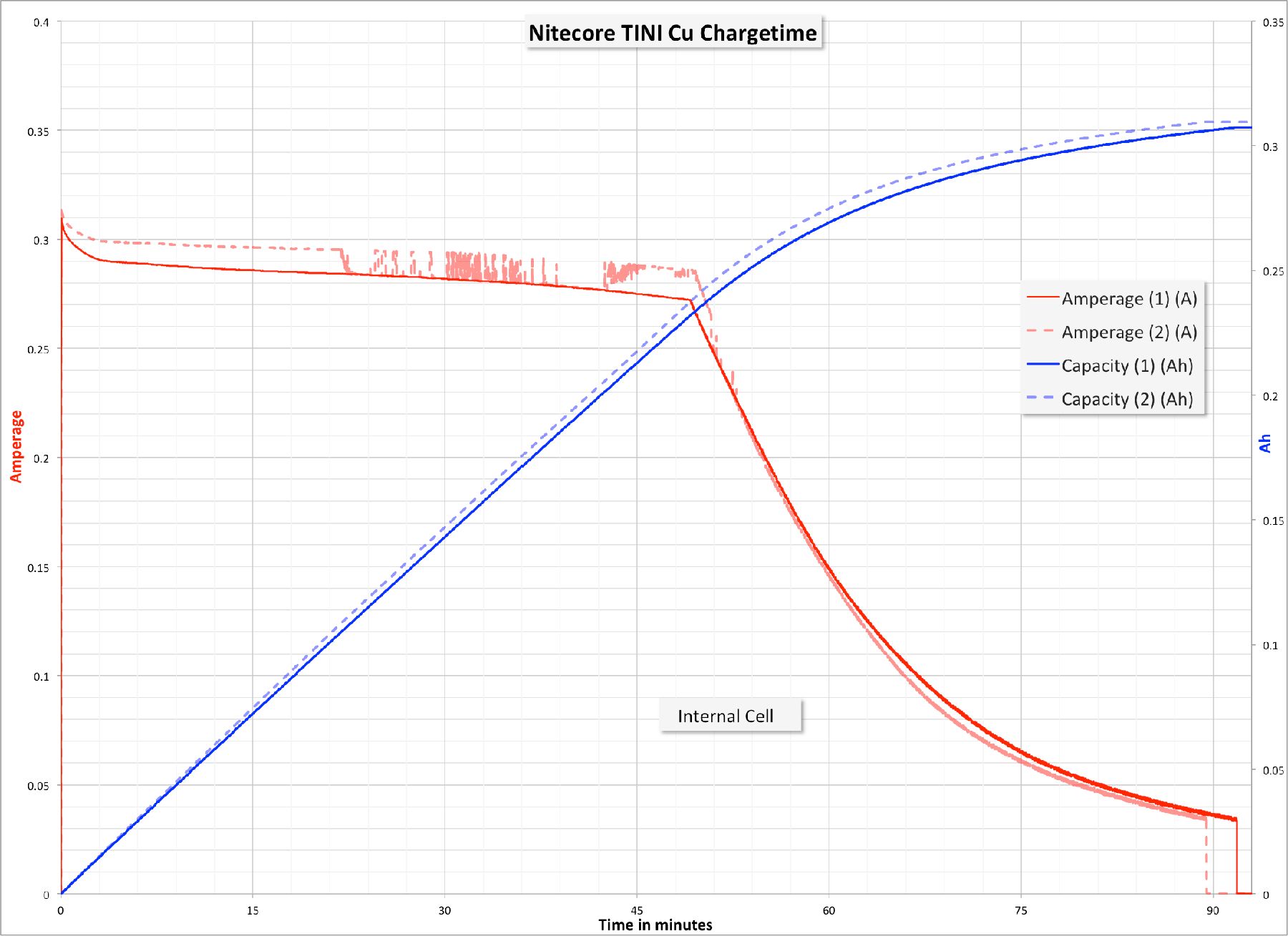 Here’s a chargetime, showing the battery is around the claimed capacity. When charging is complete, there does not seem to be any trickle charge. This is a small battery (claimed 280mAh) and charges at around 0.27A, which is approximately 1C. Good charging.