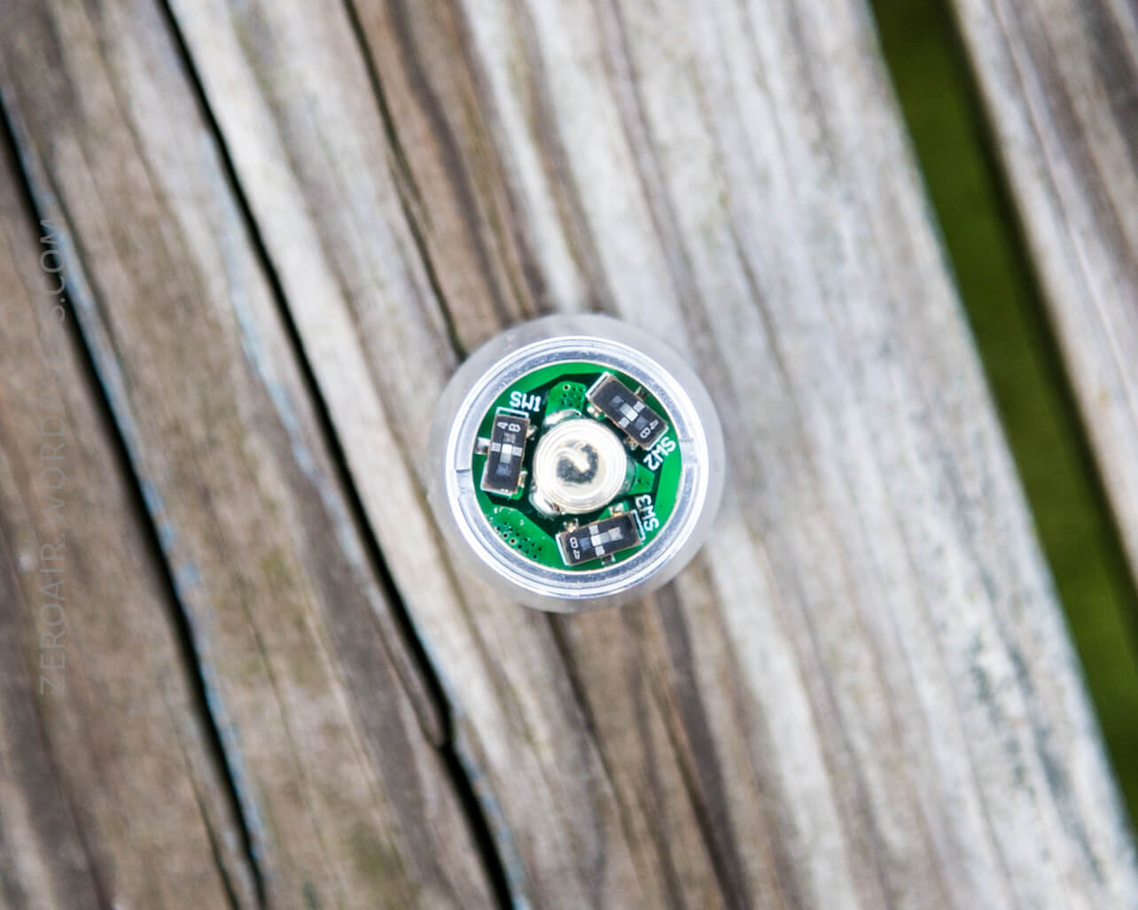 The emitter in my DIP is a Nichia 219c, 4000K. I chose two optics: Frosted Narrow, and Frosted Wide. Mine arrived with the sprue still attached. Dan normally cleans those up, but mine must have slipped through. If yours has that, just clip it off with some wire clippers or whatever.