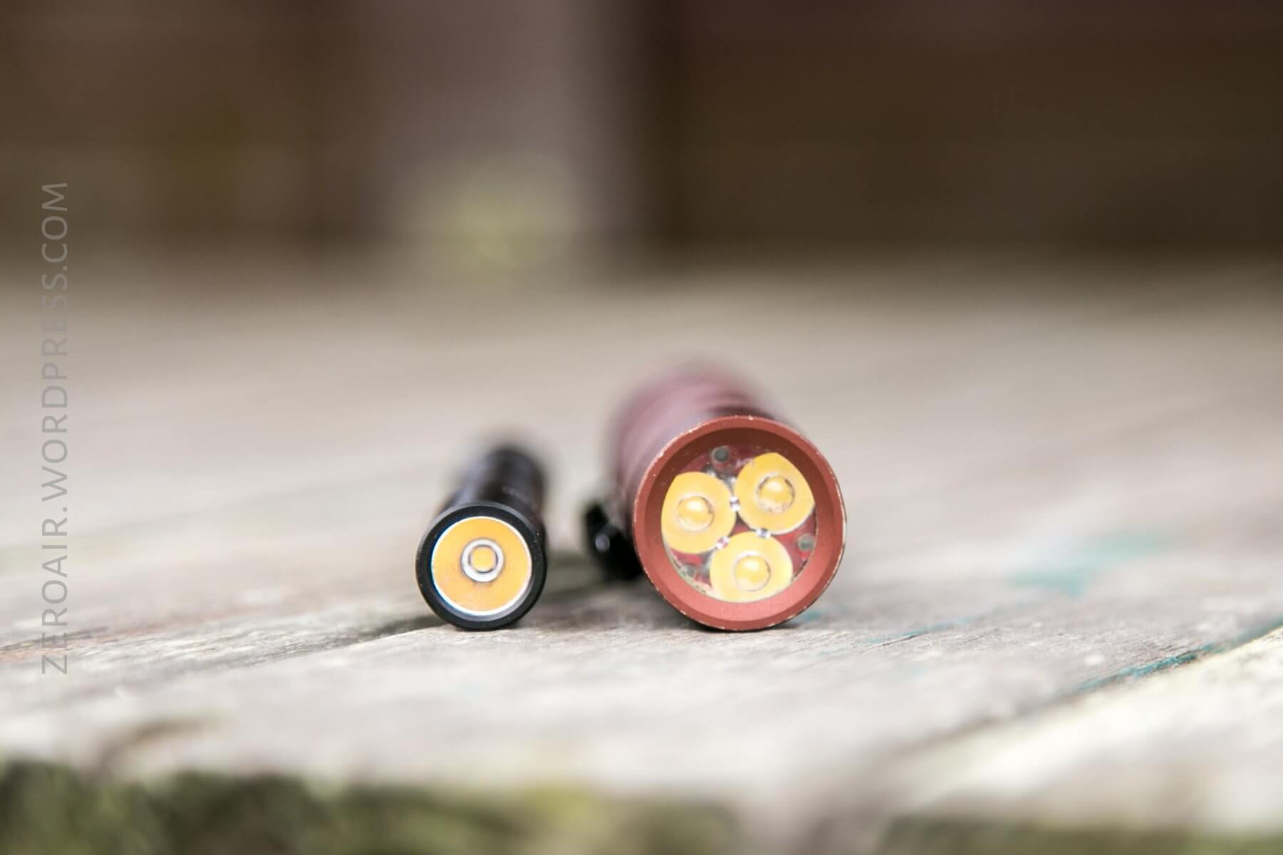 The head is also exactly the same size as the Lumintop Tool lights. Below, see that the copper version screws right onto the body. And works, too! The tailcaps are different, so it’s not possible to use the tailcap from the IYP365 on the Tools.