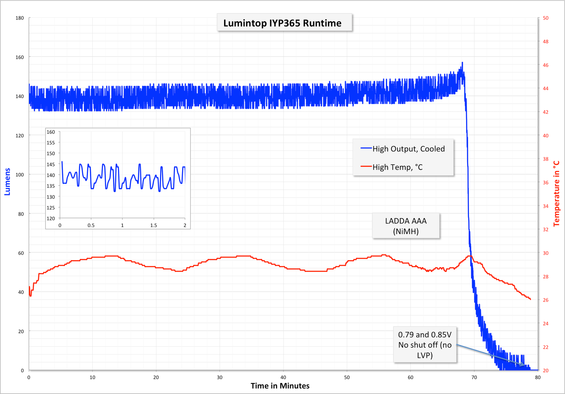 Output is very stable throughout the duration of the runtime, til about 70 minutes. The light has no LVP but doesn’t accept Li-Ion so I don’t necessarily see this as a problem. It’ll be very noteworthy that the cells are low, though, because the output drops to essentially nothing toward the end of their life.