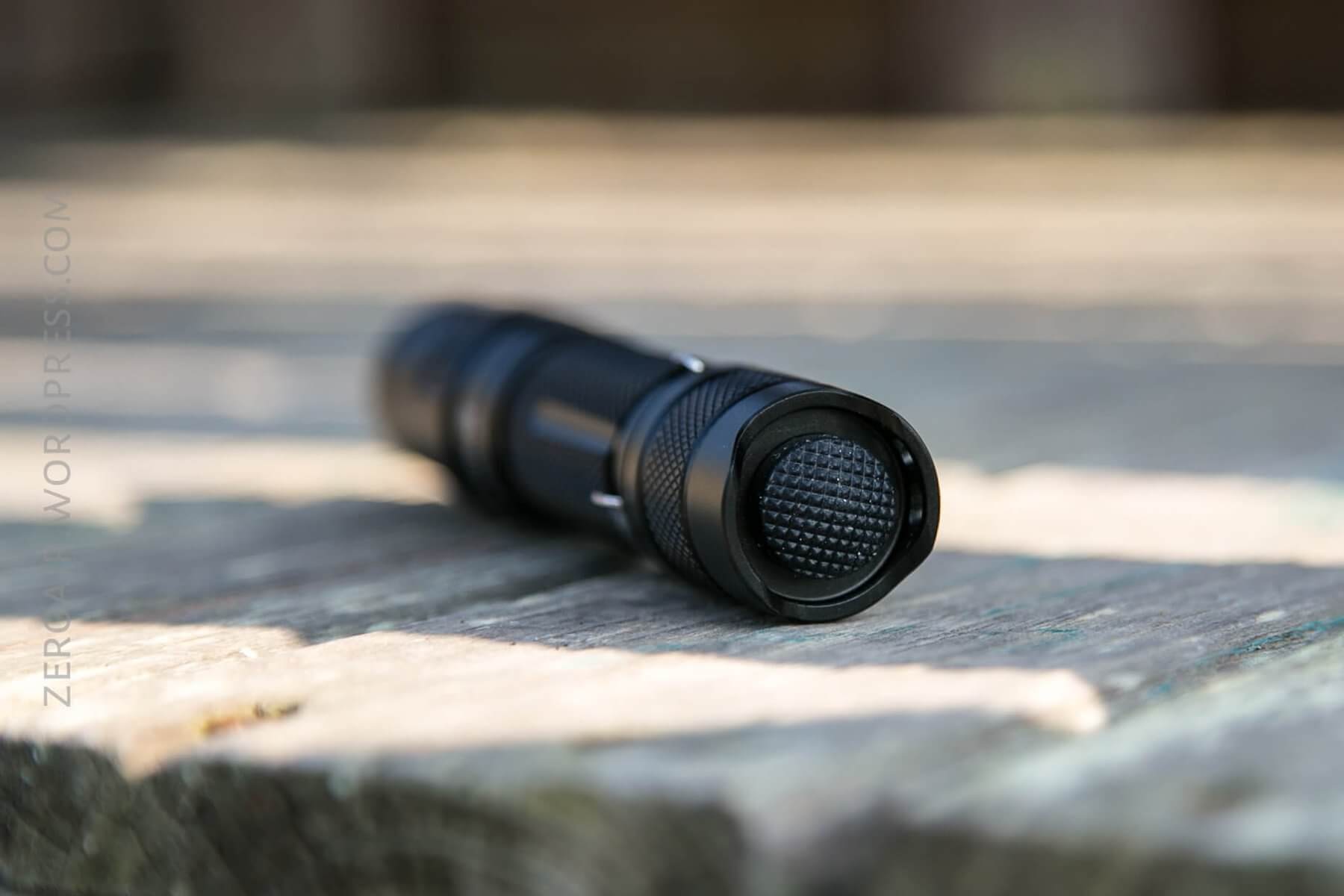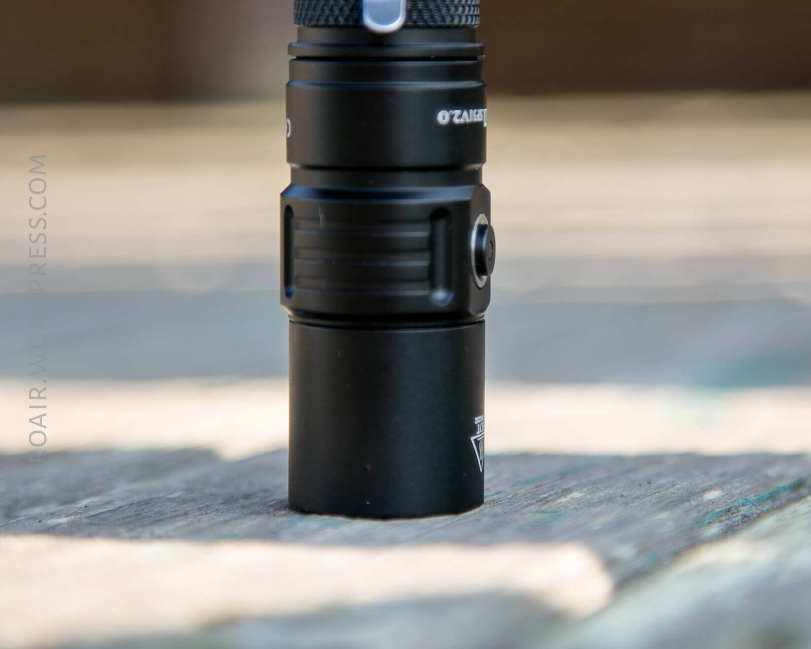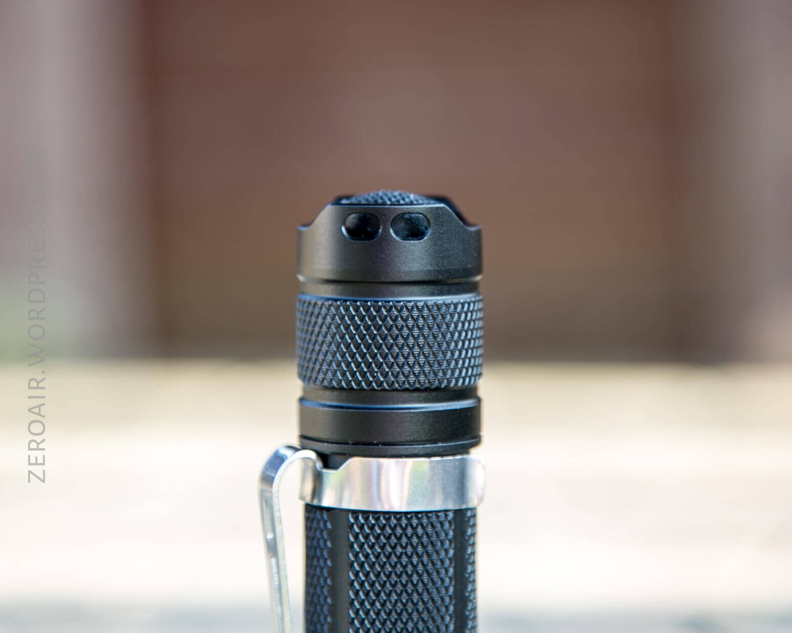 The other switch is on the head, and is an indicating e-switch. It’s nicely clicky, and has a very good action. The indicator in the center of the switch can be green or red.