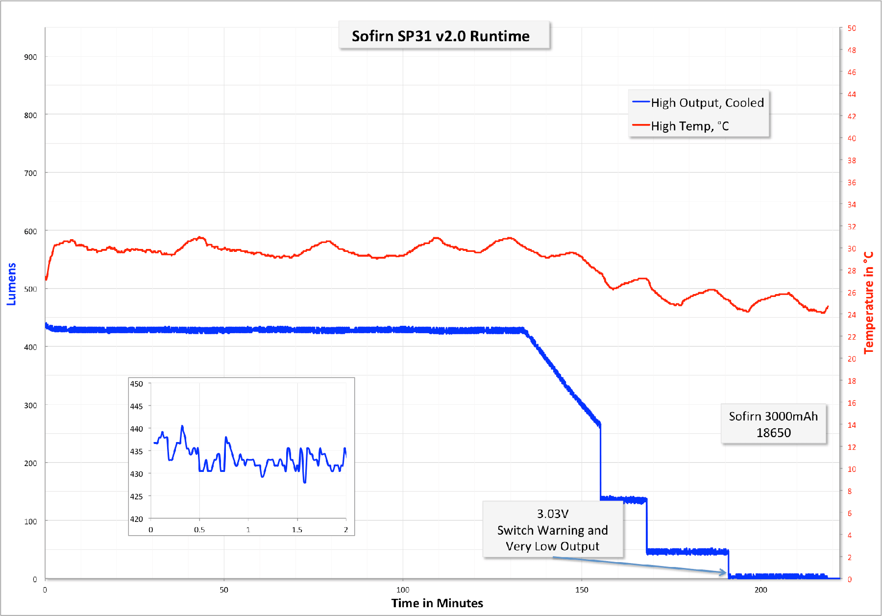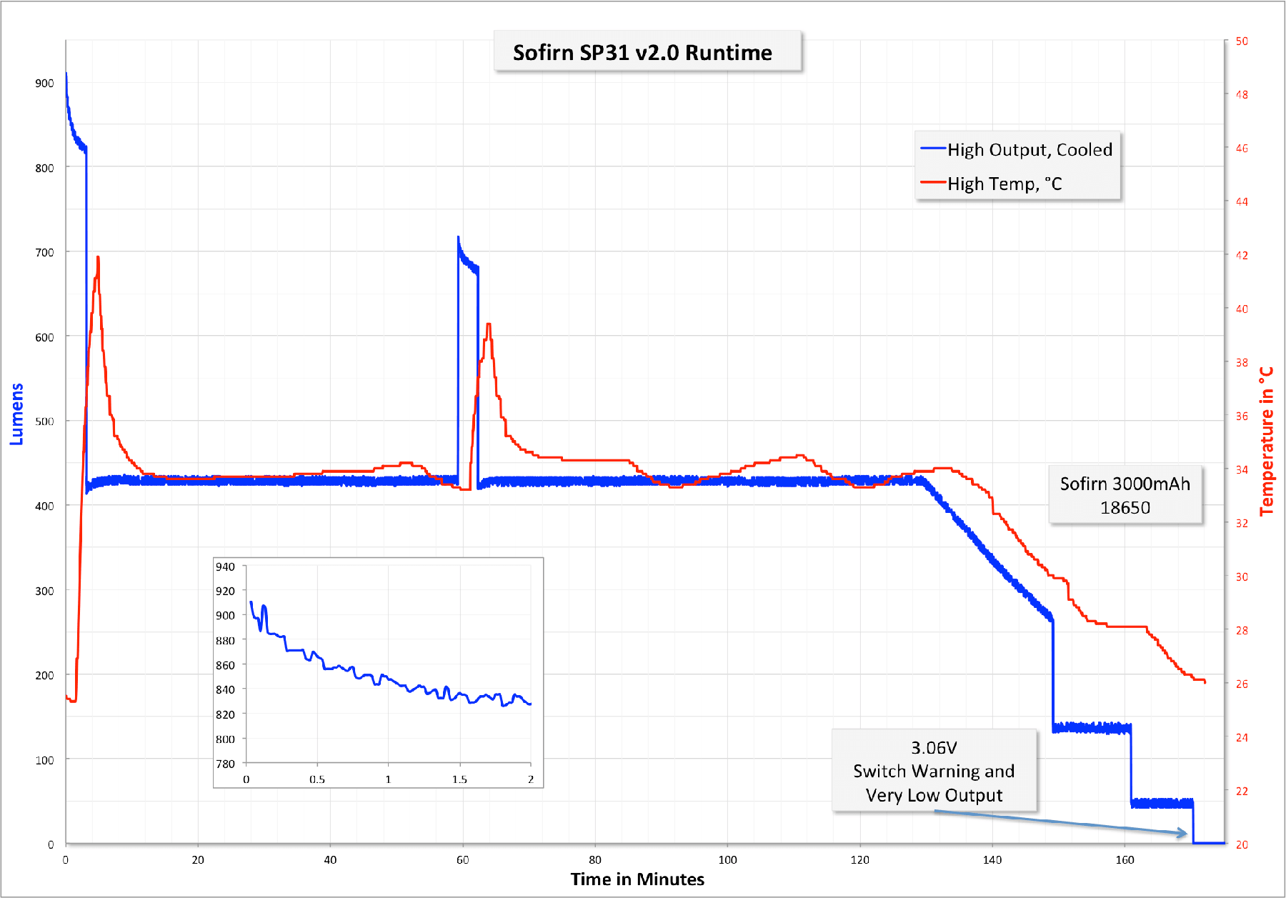 I performed a runtime on turbo, and reset the light to turbo once during the run. Turbo falls off quickly, from around 920 lumens to 840ish at 2 minutes. Not too bad. But very soon, the light steps down very hard, to the High setting. Turbo can be reset, but the output doesn’t reach the initial output. At around 3.1V, the indicating switch starts to flash slowly. The light also switches to very low output, but doesn’t switch off.