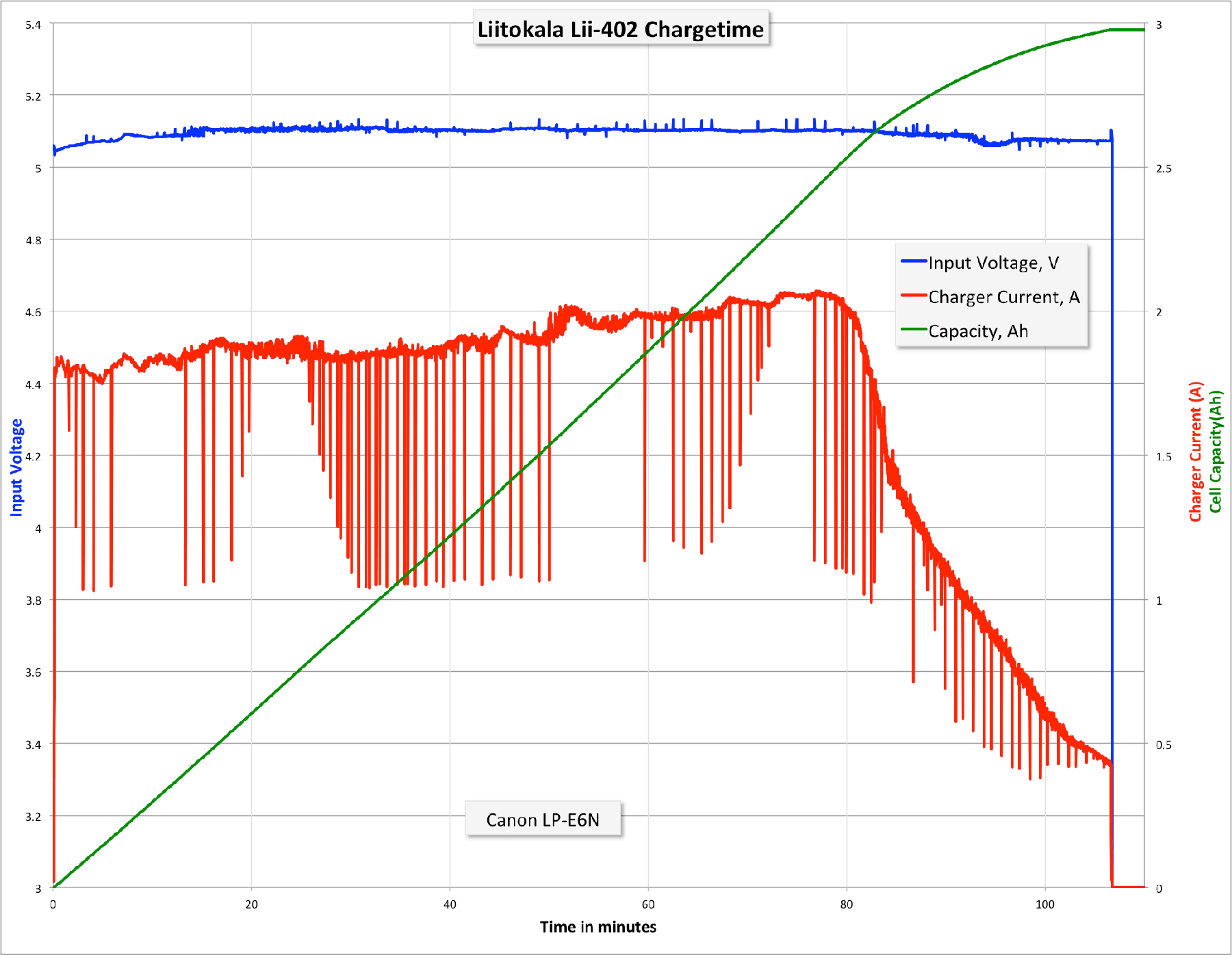 Now, the good side of this is, that with a good USB source, you’ll be charging at 2A. That’s pretty ridiculous speed (and essentially the max speed) for USB. Something to note in the graph above that brings up a good point about how this charger works: My LP-E6N didn’t actually hold ~3000mAh. It’s an 1800mAh cell. What needs to be considered is that the LP-E6N is a 7.2V battery. (And I think that the 7.2V is nominal, with a “full” voltage of around 8.4V) So the charger has to take this 5V from USB and boost it to the voltage of the battery. It’s easier to consider this in Watts since Watts are conserved. 5V at 2A = 10W. Boosted to 8.4V, the cell is seeing more like 1.2A current (10W/8.4V). That also means that since I’m measuring the current at 5V, I have to do a little bit of math to see what the capacity of my battery is. That math is (5V/8.4V) x 3000=1786mAh. That doesn’t consider any inefficiencies but is a more realistic reading for my battery.