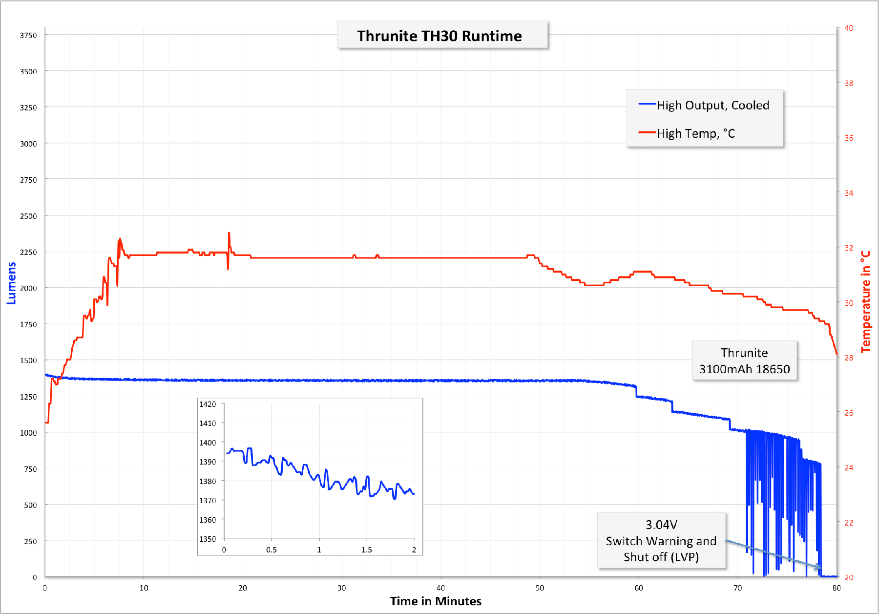 Below is a runtime on Turbo. The temperature spikes a little at first, but the stepdown is quick (less than a minute, fan-cooled). Once the stepdown has happened, it’s possible to hit Turbo again, but the light doesn’t quite hit the initial output. Once the stepdown has happened, the light maintains extremely steady output at a level just lower than “High.”