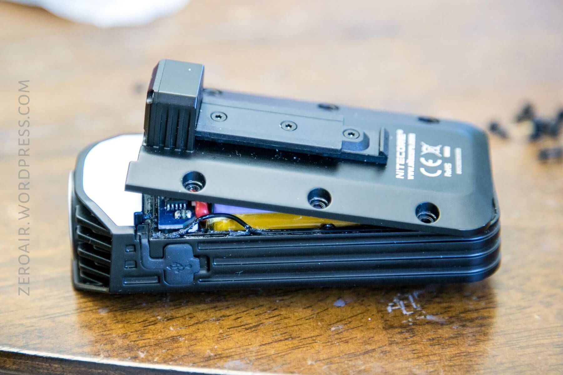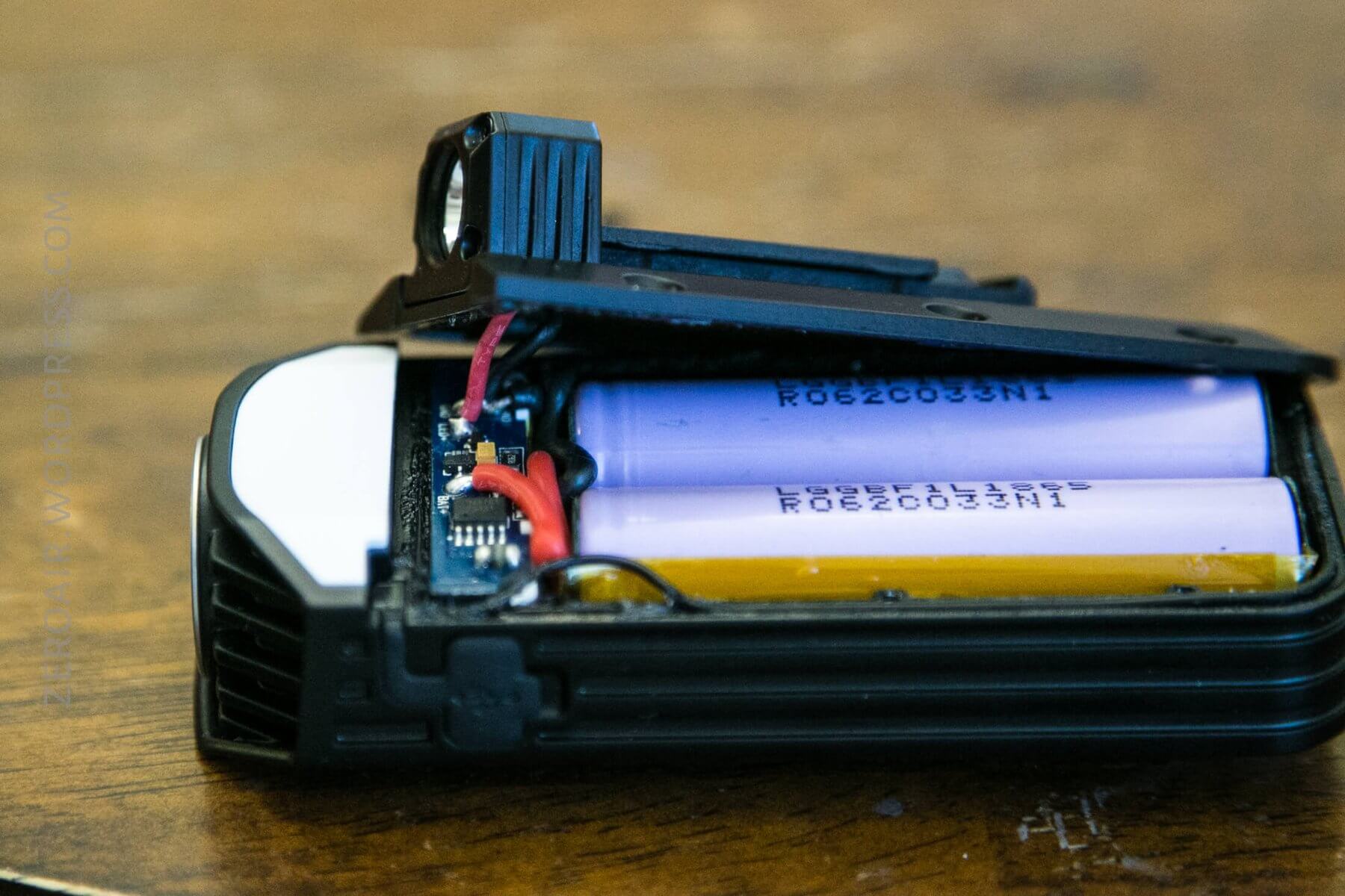 As stated above, the light is powered by two built-in unprotected 18650 cells in parallel (also evident because Nitecore calls it a 6800mAh battery). It’s theoretically possible to change the cells; so is an elevator to the moon. These cells are soldered in, and if you’re inclined, could feasible be replaced.