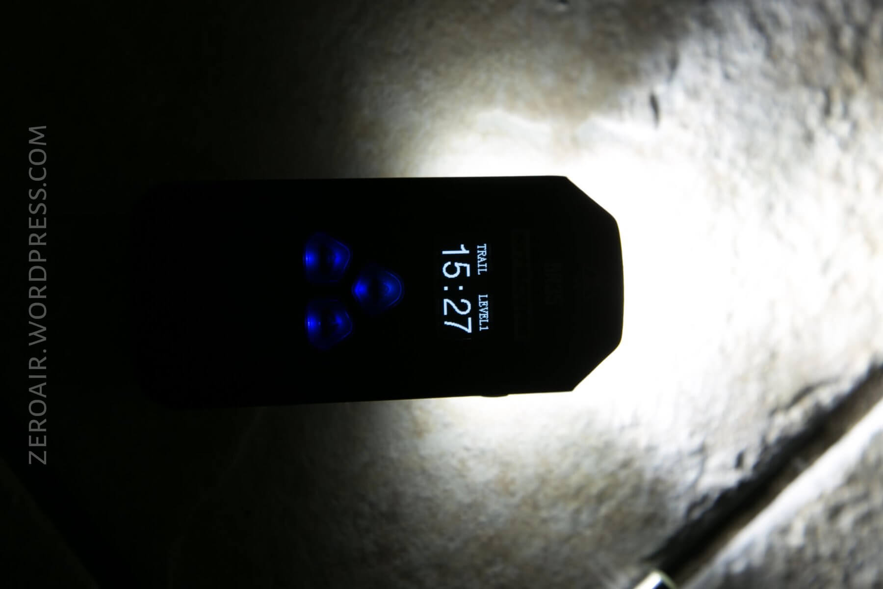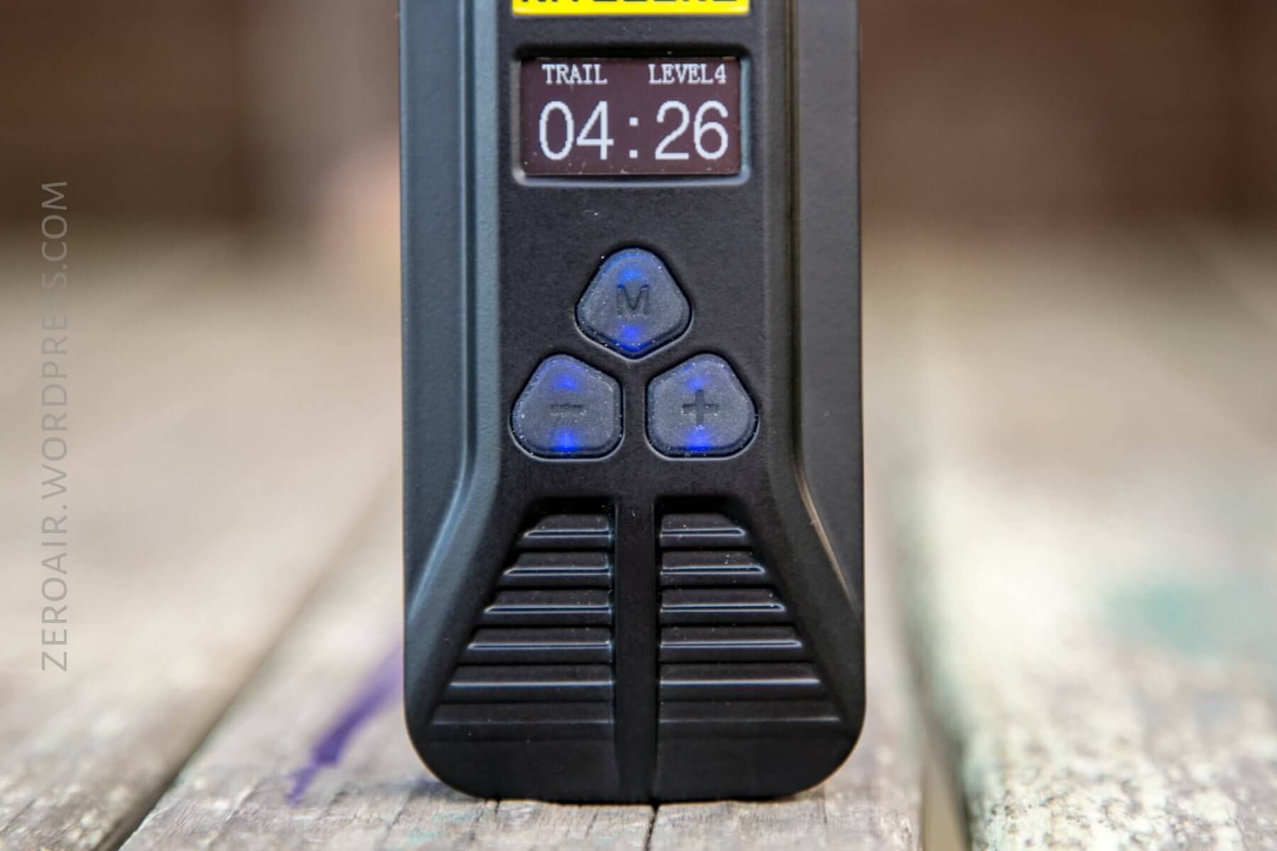 During operation, there are a few things that are always displayed. First (top left) is the mode group (in the case below, “TRAIL”) (more on that later). Next is the mode level (“LEVEL [1-4]). Below those two is the runtime, in H:M format. This runtime continually updates, and seems to overestimate at first.