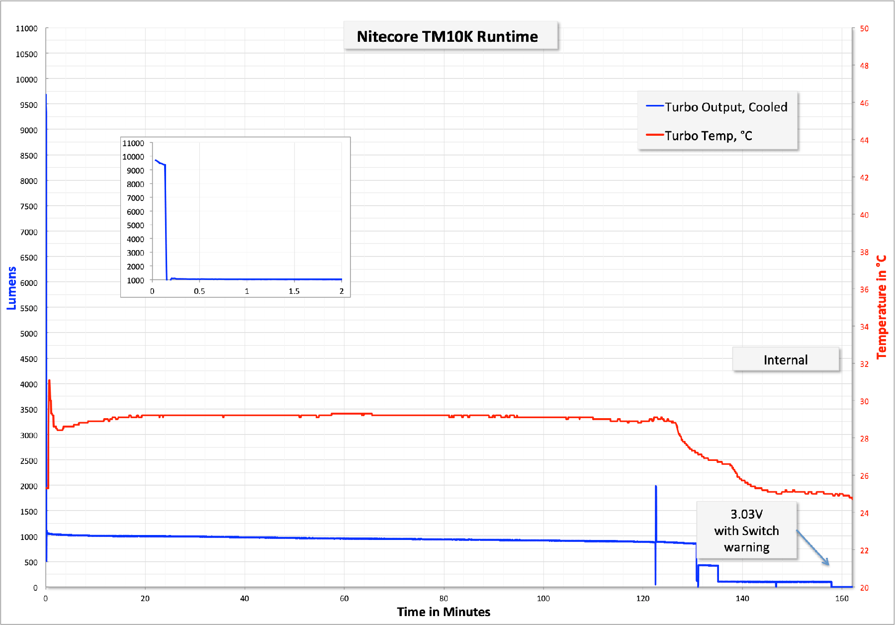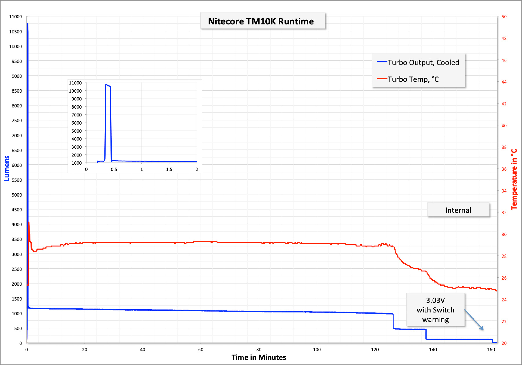 All of that said, the lit really only outputs 10K lumens very briefly. So briefly that any runtime on “Turbo” is effectively a runtime on High, as the light steps down to the 1000 lumen mode very quickly. So here are two runtimes, both on Turbo, but this is essentially how High mode (1000 lumens) acts too. Each of the step downs it so one of the discreet modes and isn’t arbitrary. Turbo steps down to 1000 High. High steps down to ~300 Mid. Mid steps down to ~100 Low. Low steps down to ~3 Ultralow.